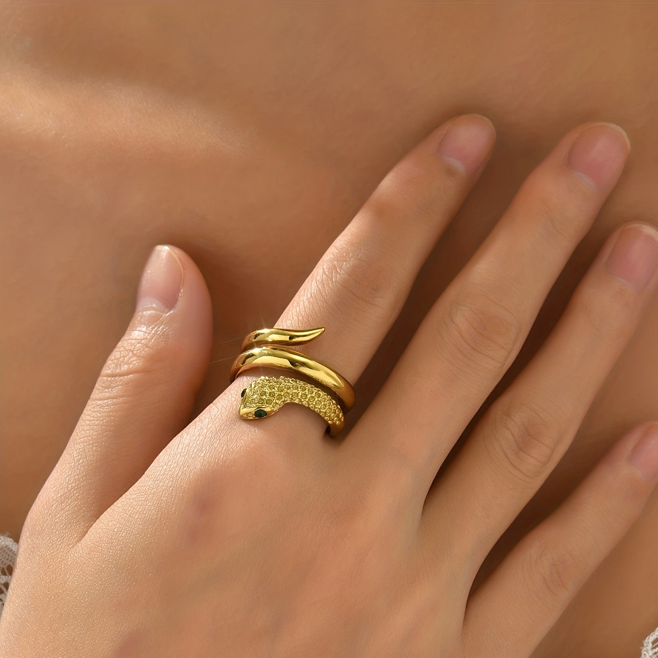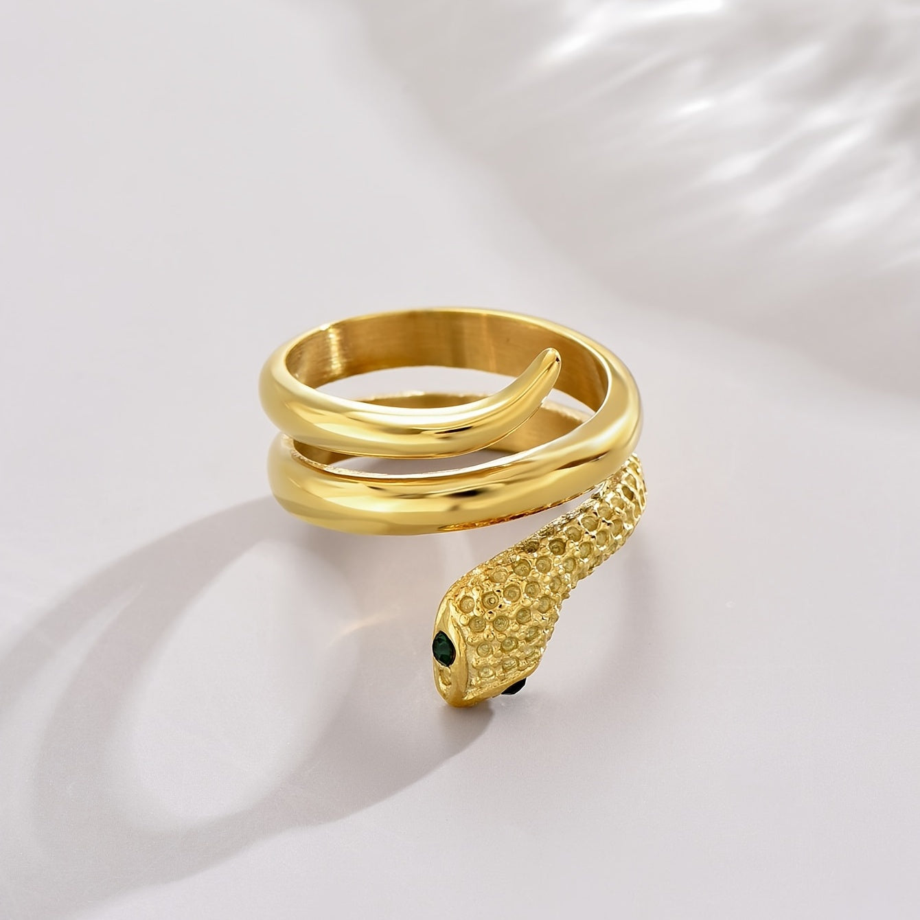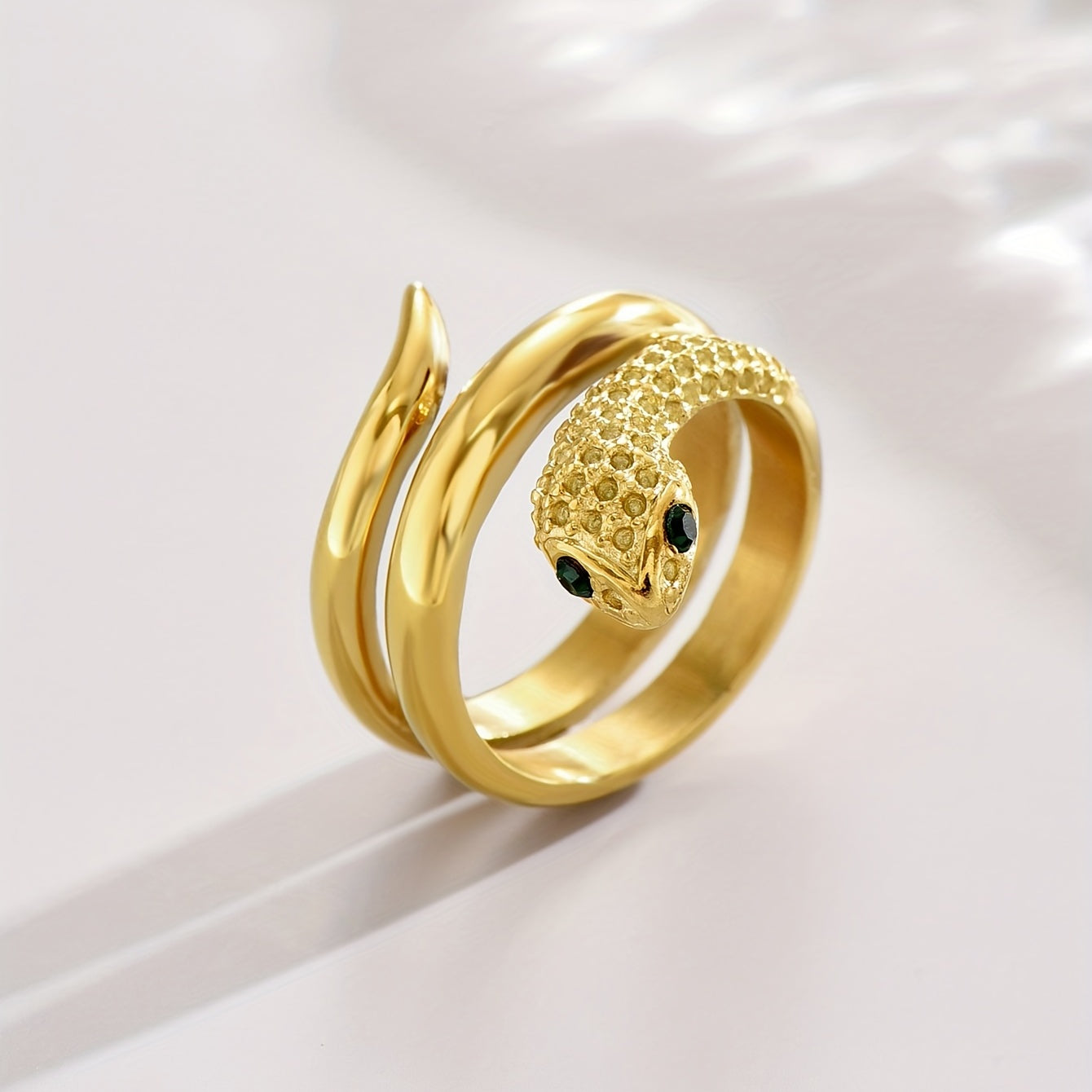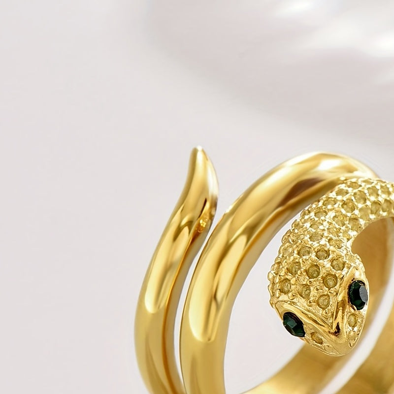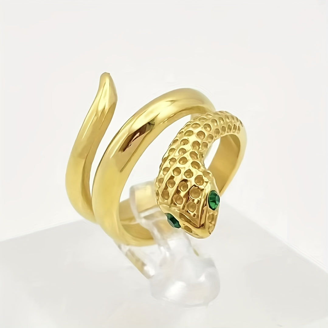 This stunning snake ring features a green zircon stone, making it a unique zodiac-inspired jewelry piece. The ring is crafted from high-quality stainless steel with a golden plated finish.
