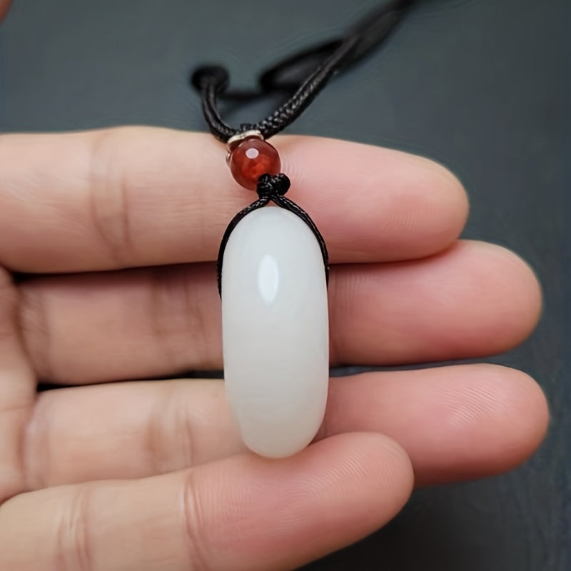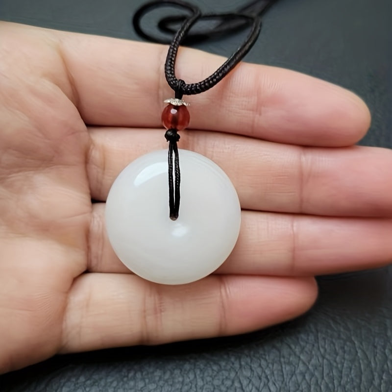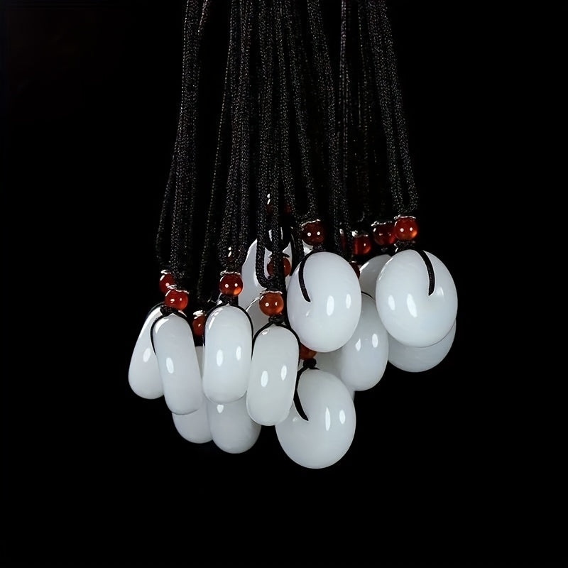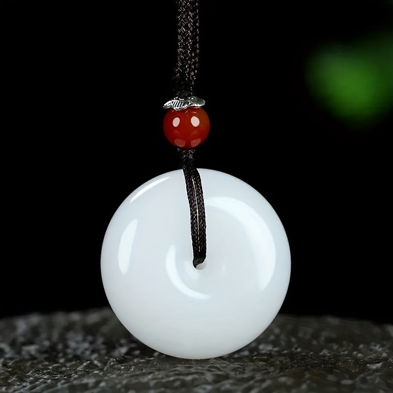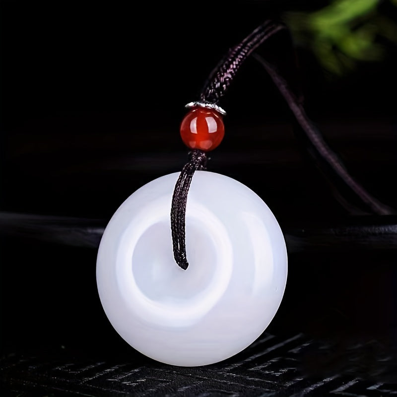 This beautiful jade pendant is a symbol of peace and harmony. It is perfect for couples to wear and share a special bond. The intricate design and golden silk accent make it a unique piece of jewelry.