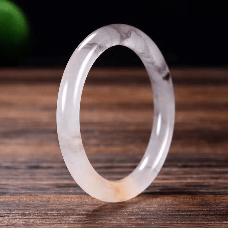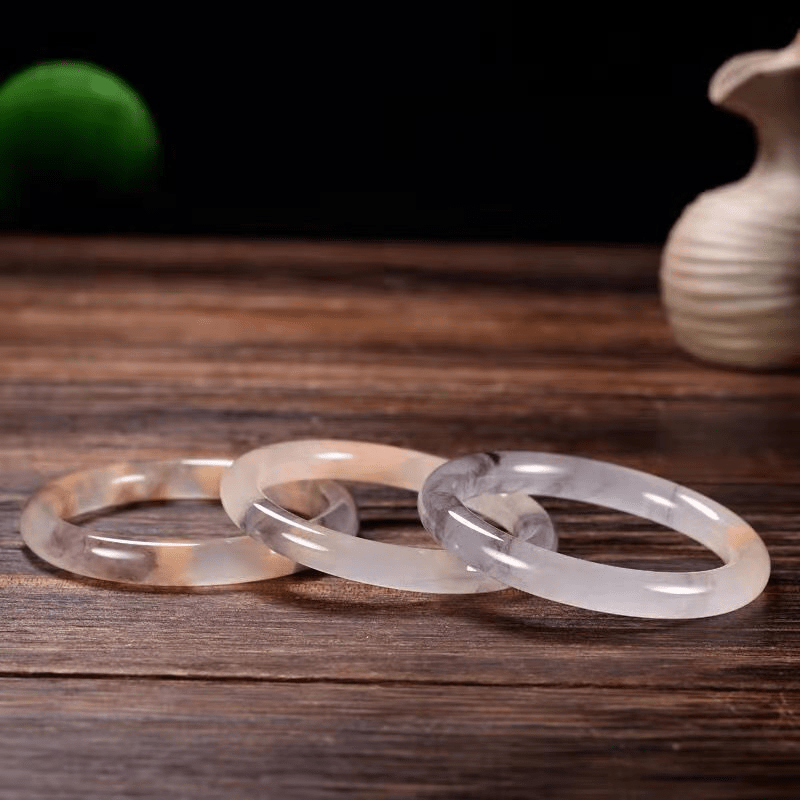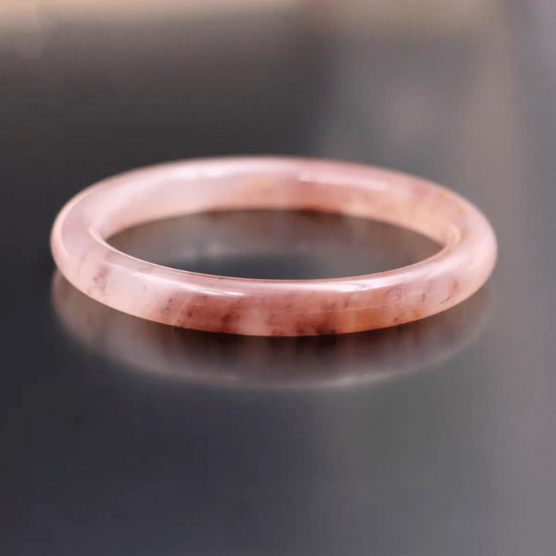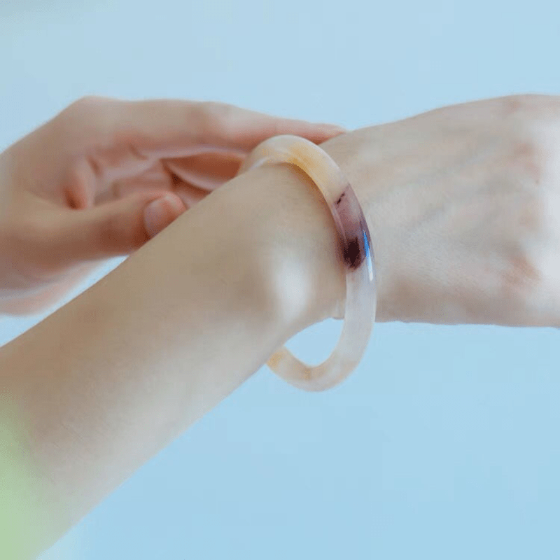 Add a touch of elegance to your look with this versatile bracelet featuring golden silk jade and violet small round bar jingle design.