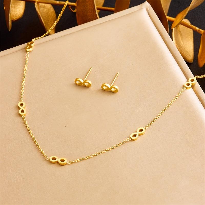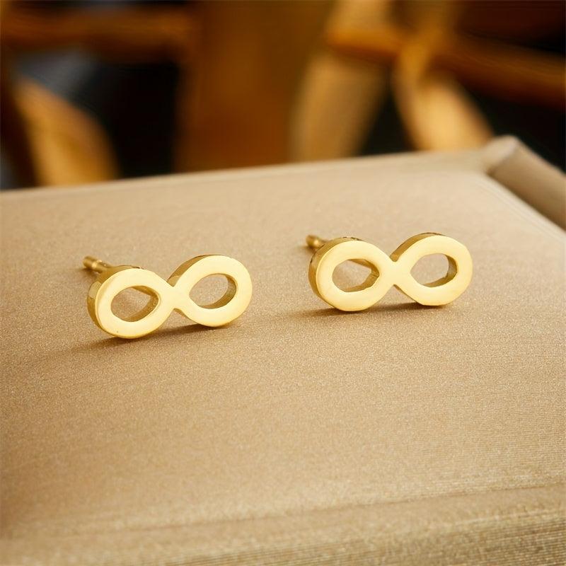 Elegant and trendy 8-shaped pendant earrings in a versatile design. Light in weight, suitable for daily wear. Made from high-quality stainless steel with a fashionable golden finish.