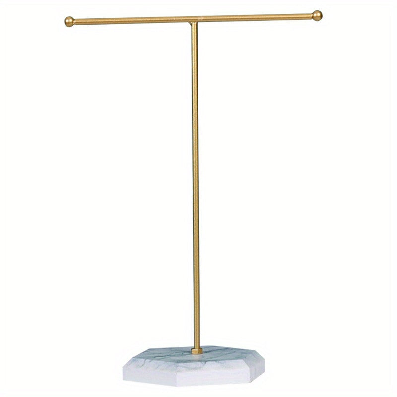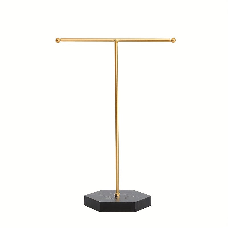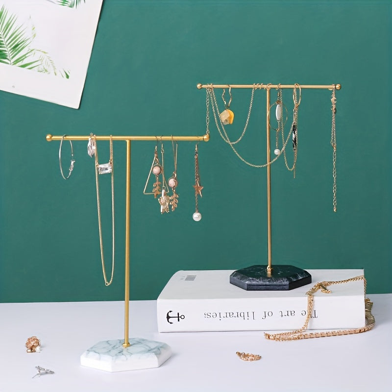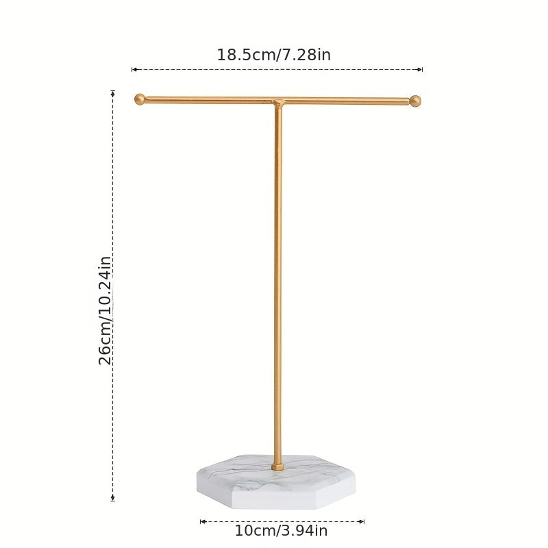 Keep your necklaces, earrings, bracelets, and rings organized with this classic golden T-shaped storage rack. Perfect for any jewelry enthusiast.