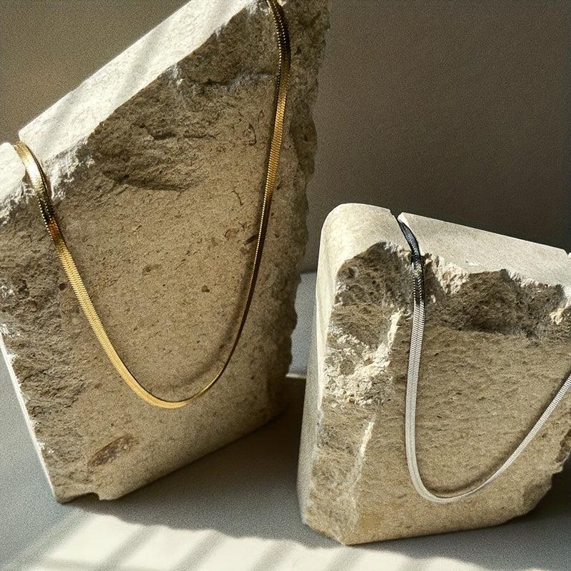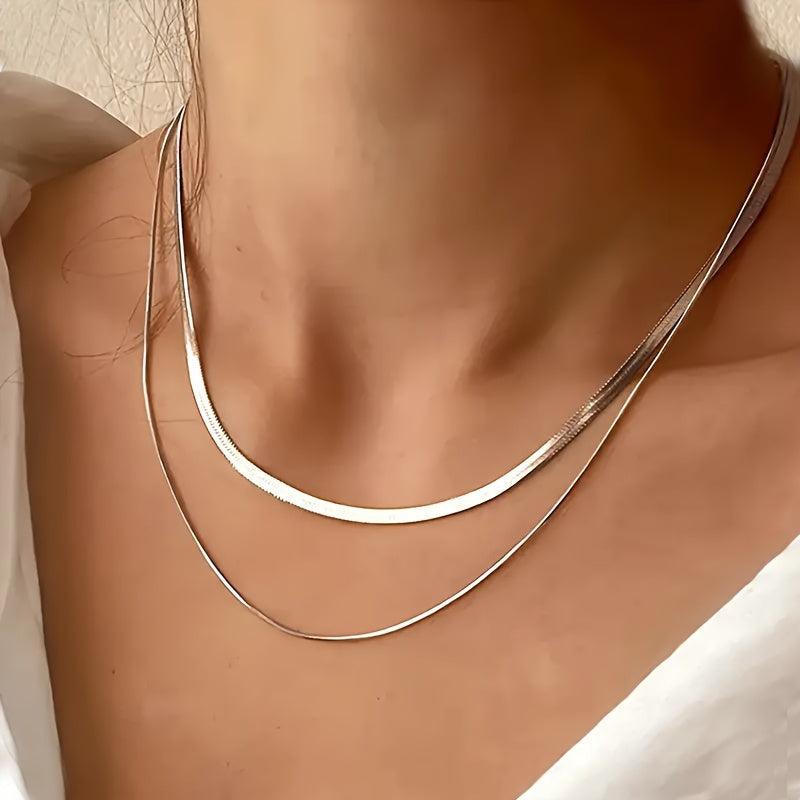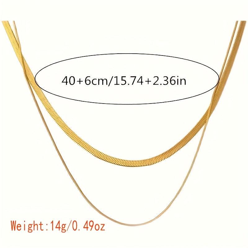 This sleek choker necklace features a double layered design with a versatile flat bone chain in a golden tone. It's the perfect accessory for summer and makes a great gift for both men and women.