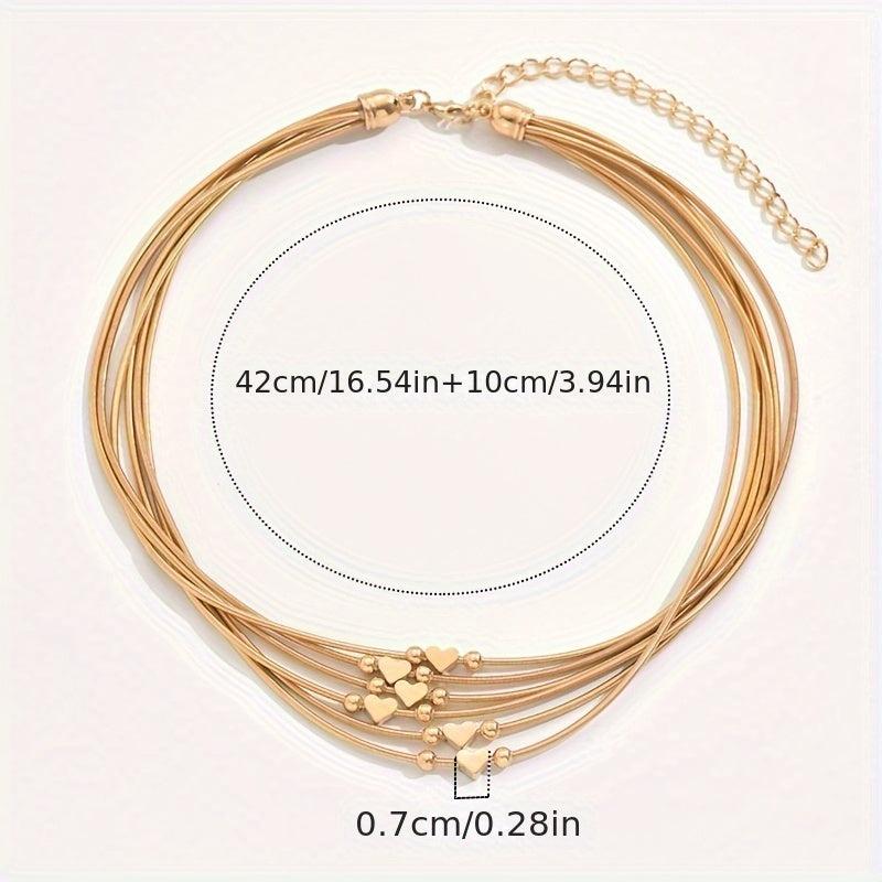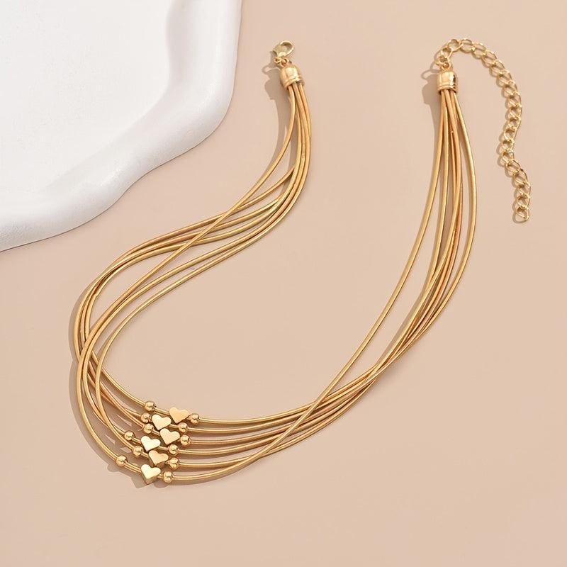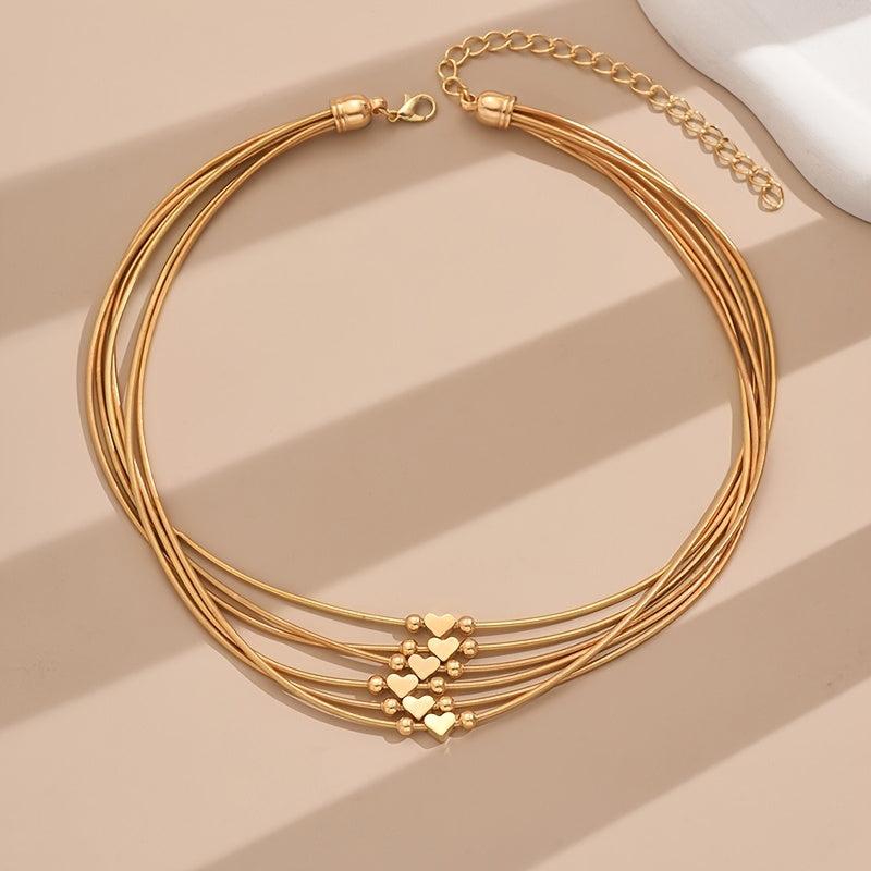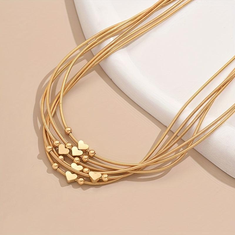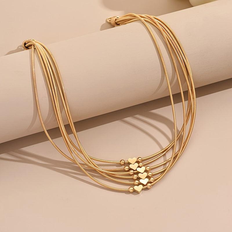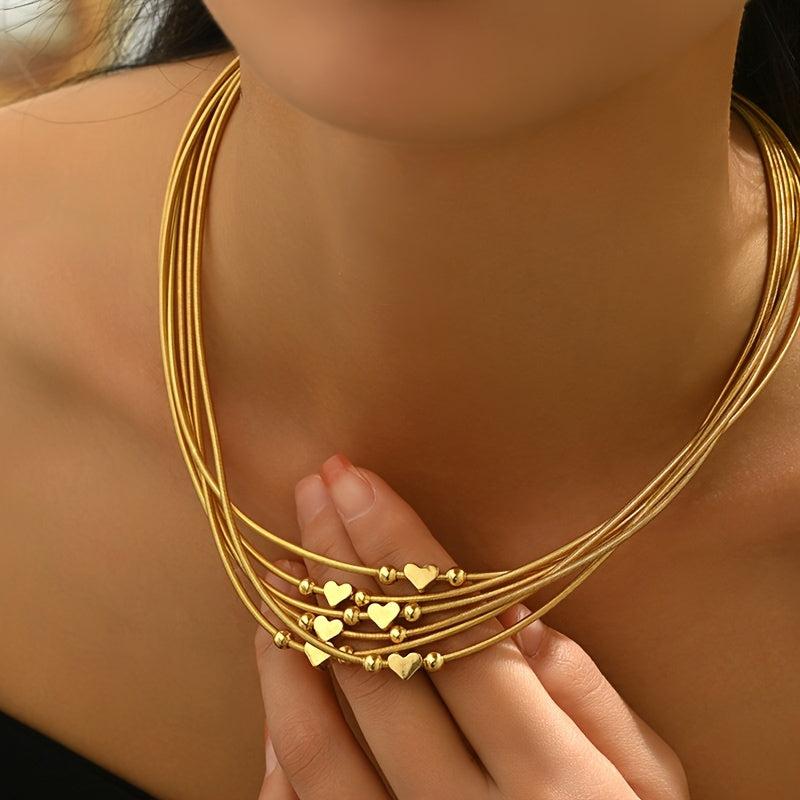 This women's necklace features intertwined layered chains with heart pendants in a versatile design suitable for daily wear and parties.