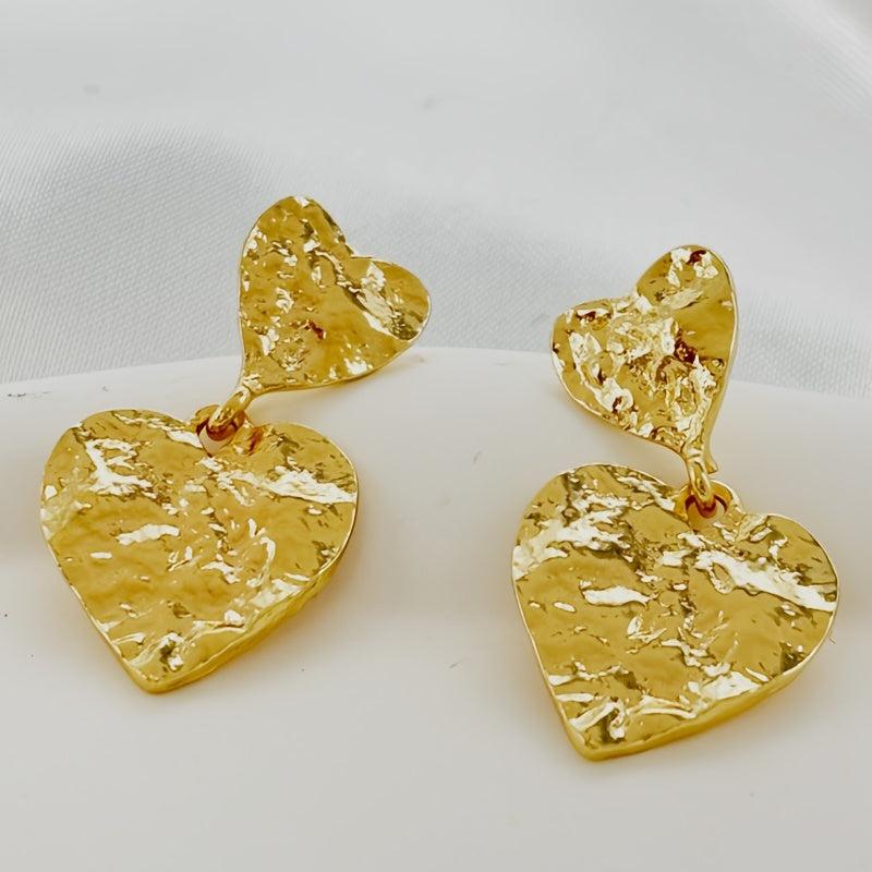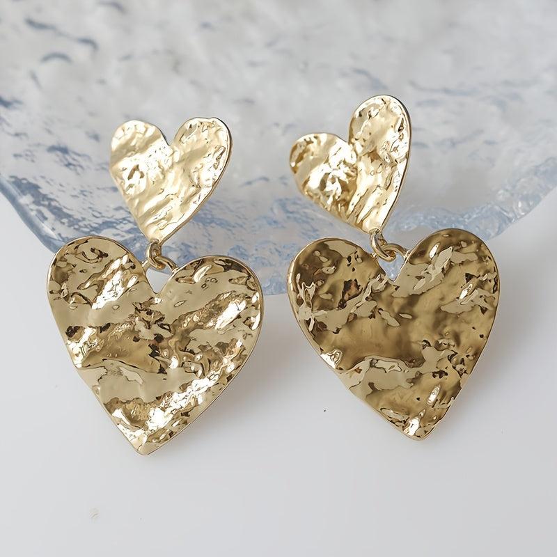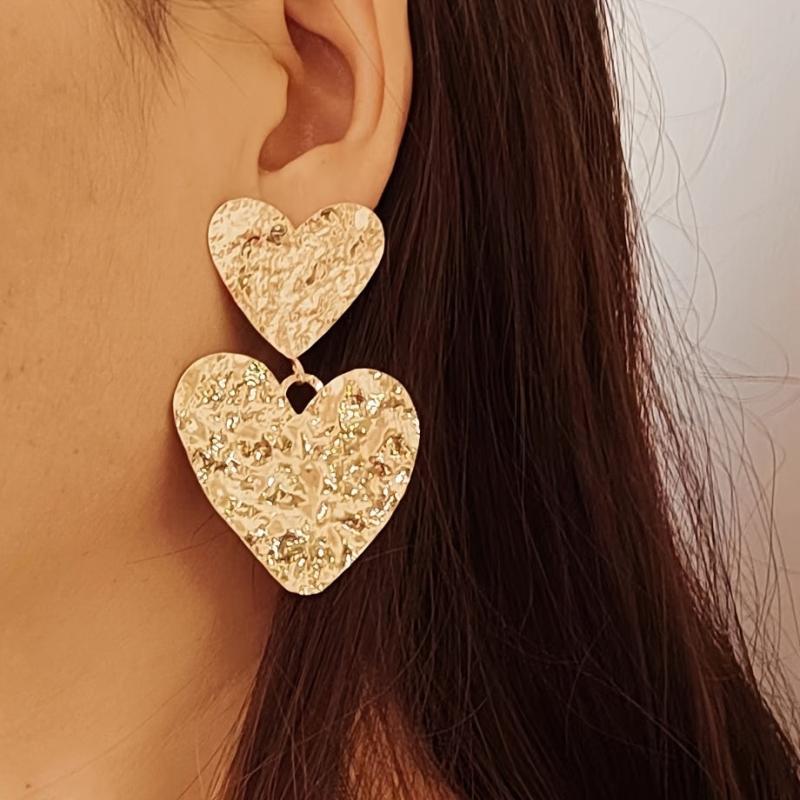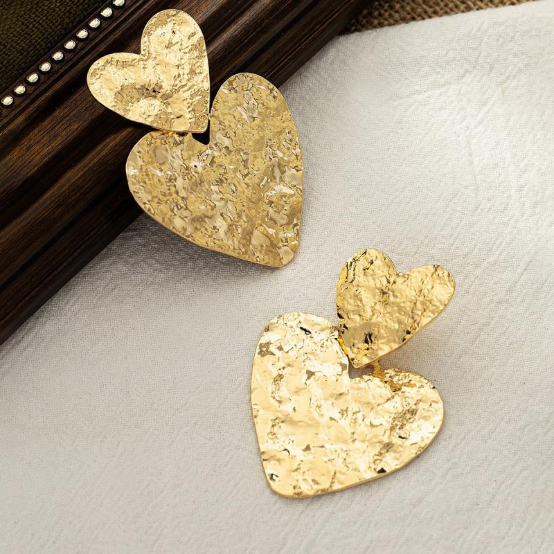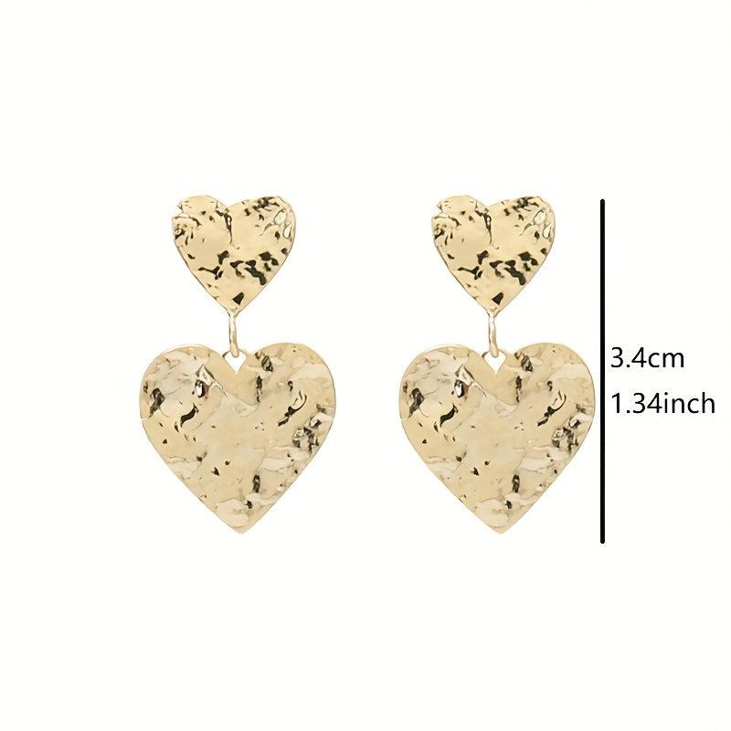 Add a touch of vintage charm to your casual attire with these double layer heart-shaped earrings. The hammered texture and golden tone metal make them a perfect accessory for any bohemian look.