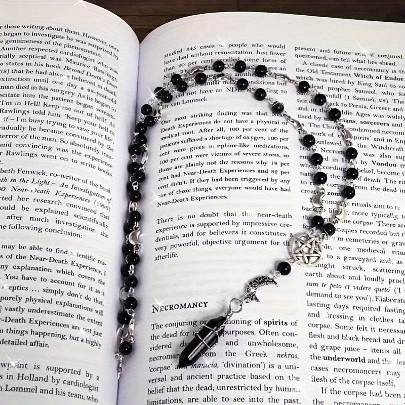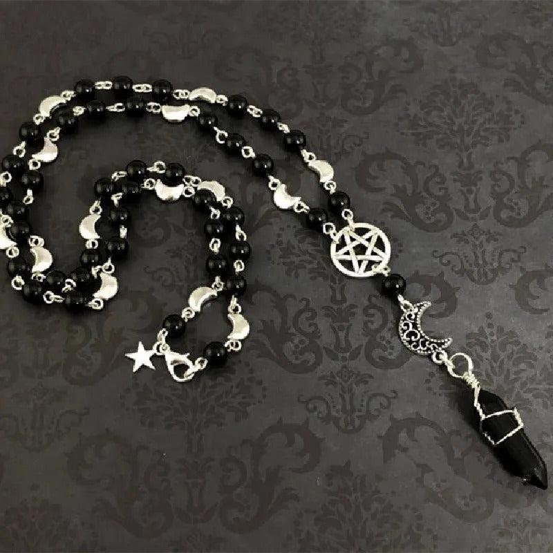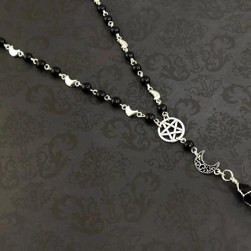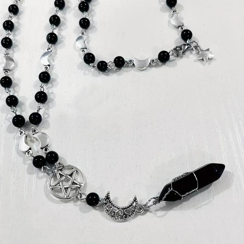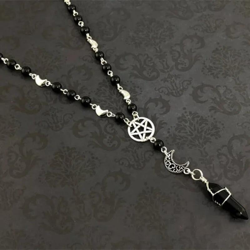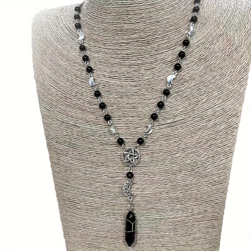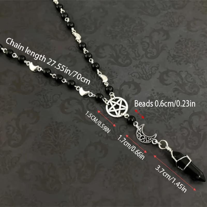 Elegant necklace featuring a pentagram and crescent moon pendant, perfect for daily wear or Halloween costume. Plated K synthetic stone adds a touch of mystique and charm.