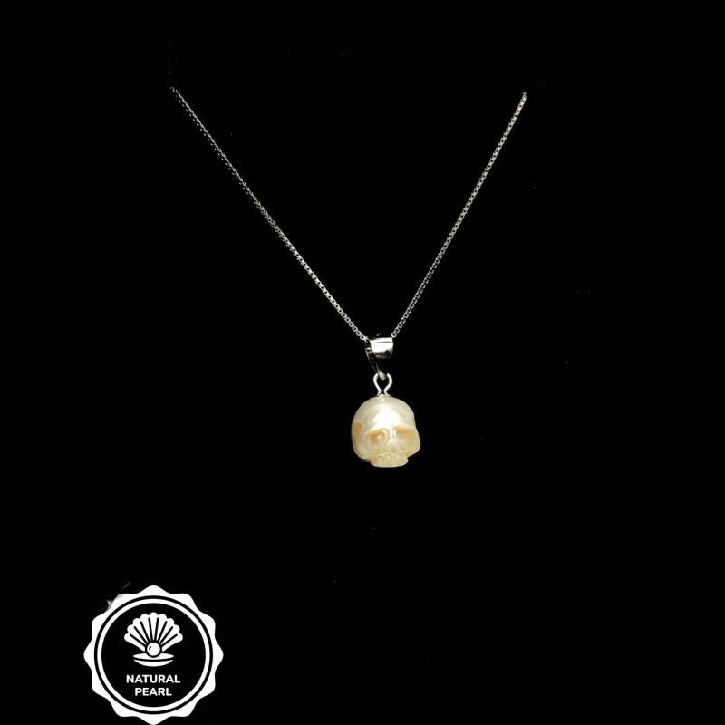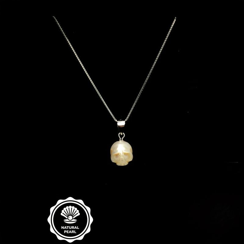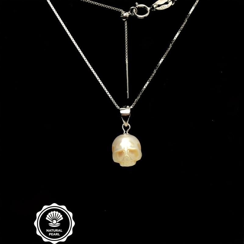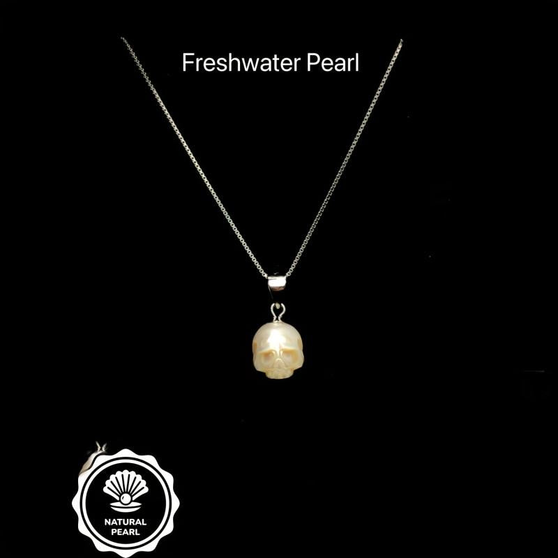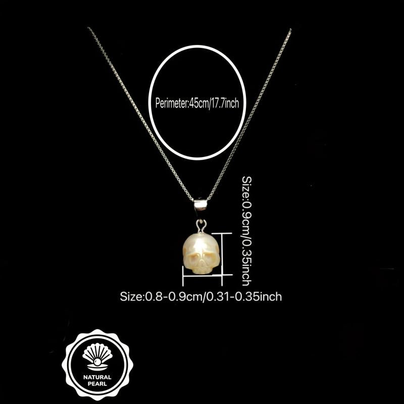 This handcrafted pendant necklace features a freshwater pearl skull design in a gothic style. Made of 925 sterling silver, it is perfect for daily wear or as a gift. Ideal for Halloween.