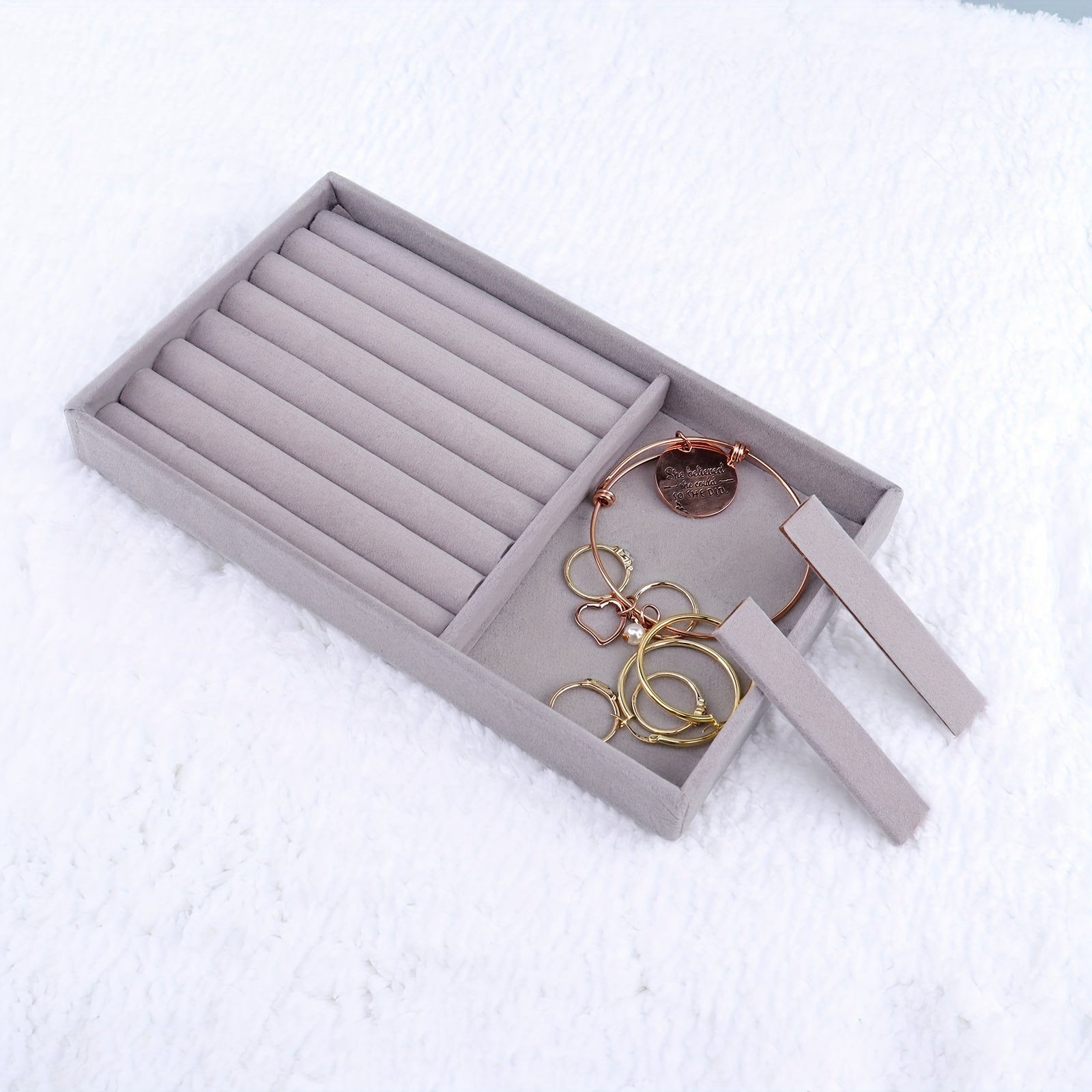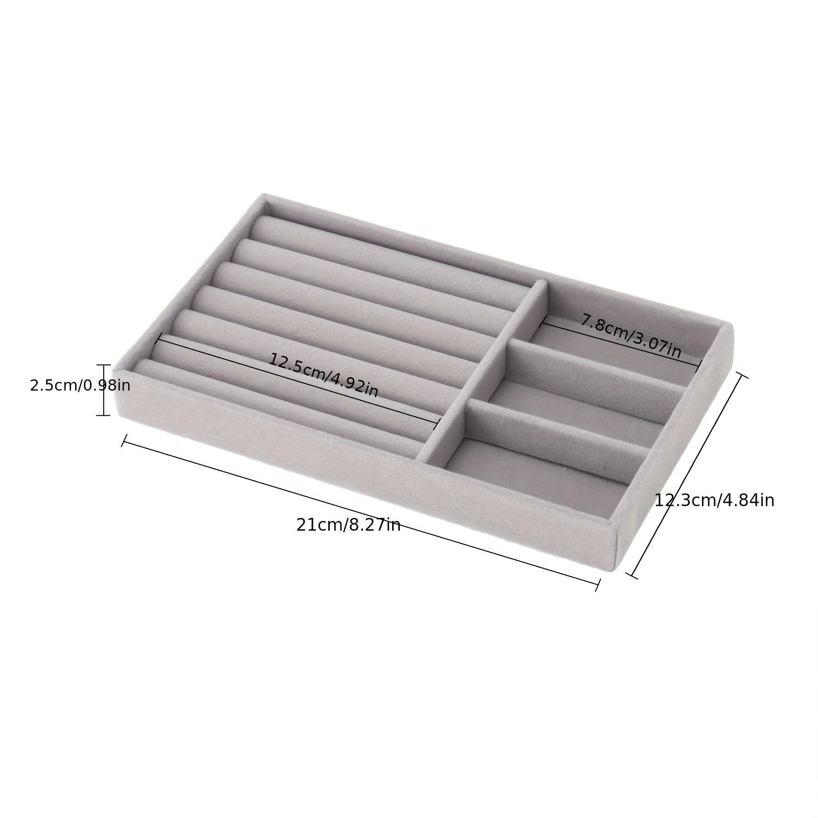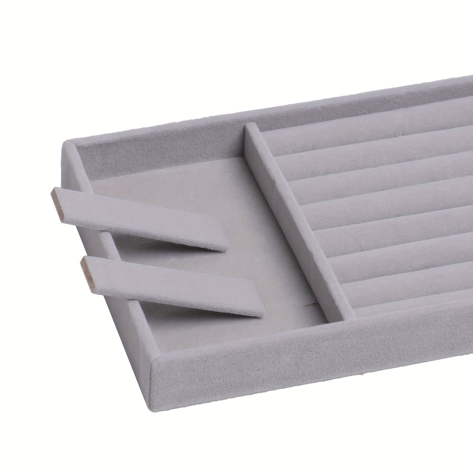 This jewelry display tray is made of gray velvet and comes with a dustproof storage box. It features removable partitions for easy organization of earrings and other jewelry items.
