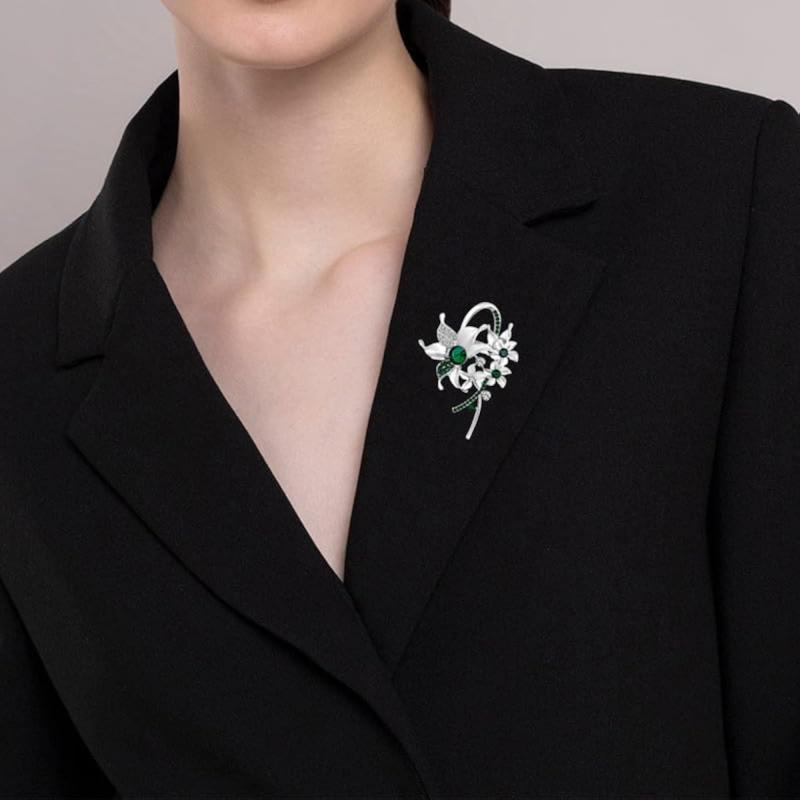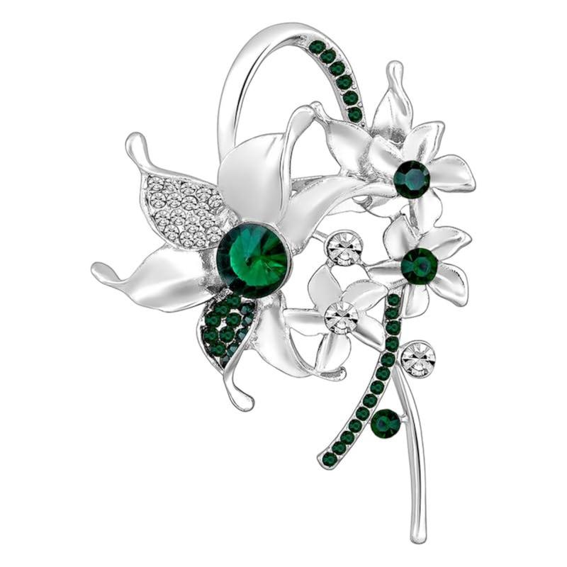 Add a touch of elegance to your attire with this stunning rhodium-plated deer-shaped saree pin adorned with green crystals. Perfect for weddings or special occasions.
