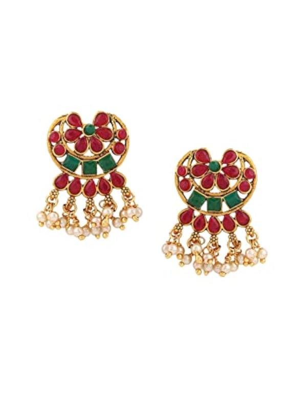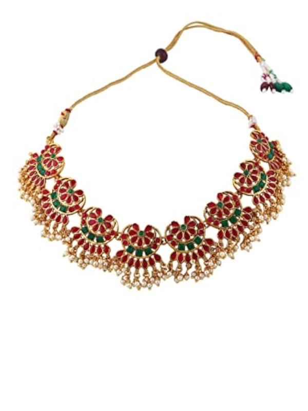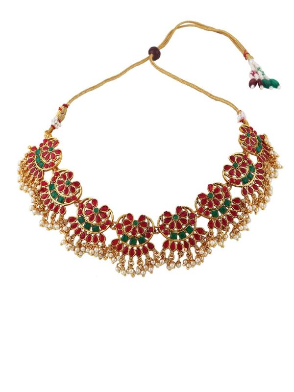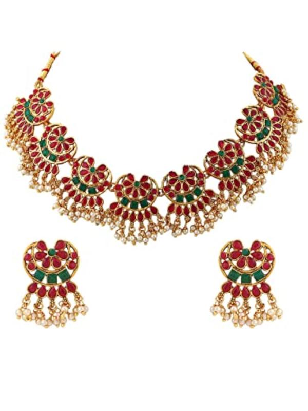 Elegant jewellery set featuring green and red kundan stones and pearls, crafted in gold-plated design.