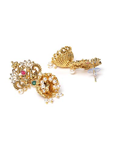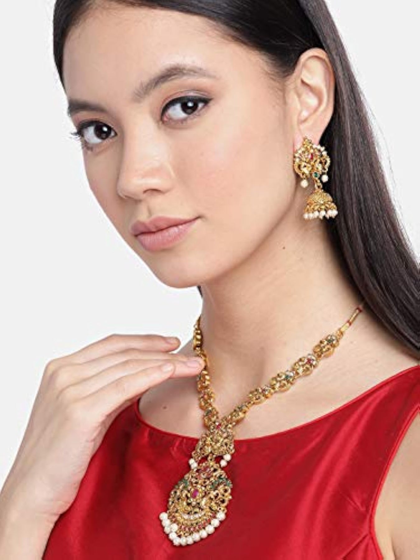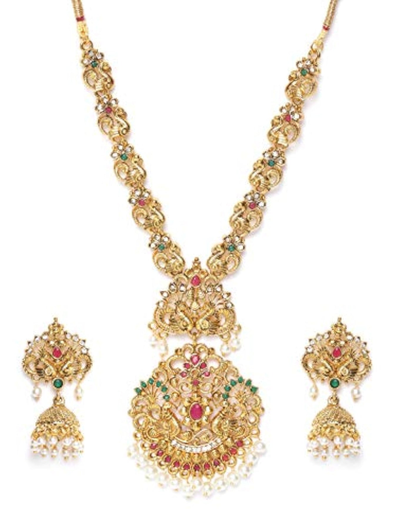 This stunning ethnic necklace and earring set features green stones with a peacock design, adding an elegant touch to any outfit.