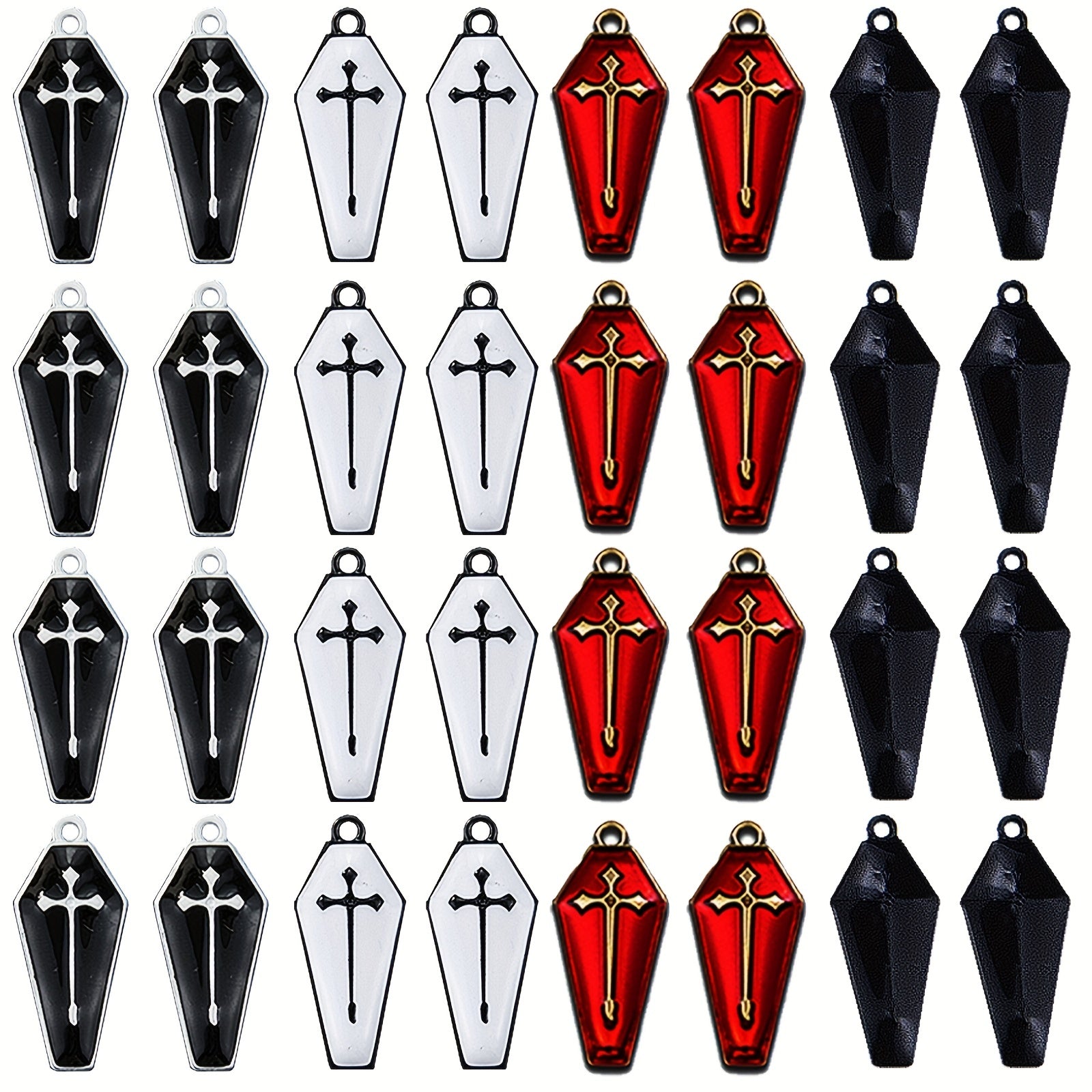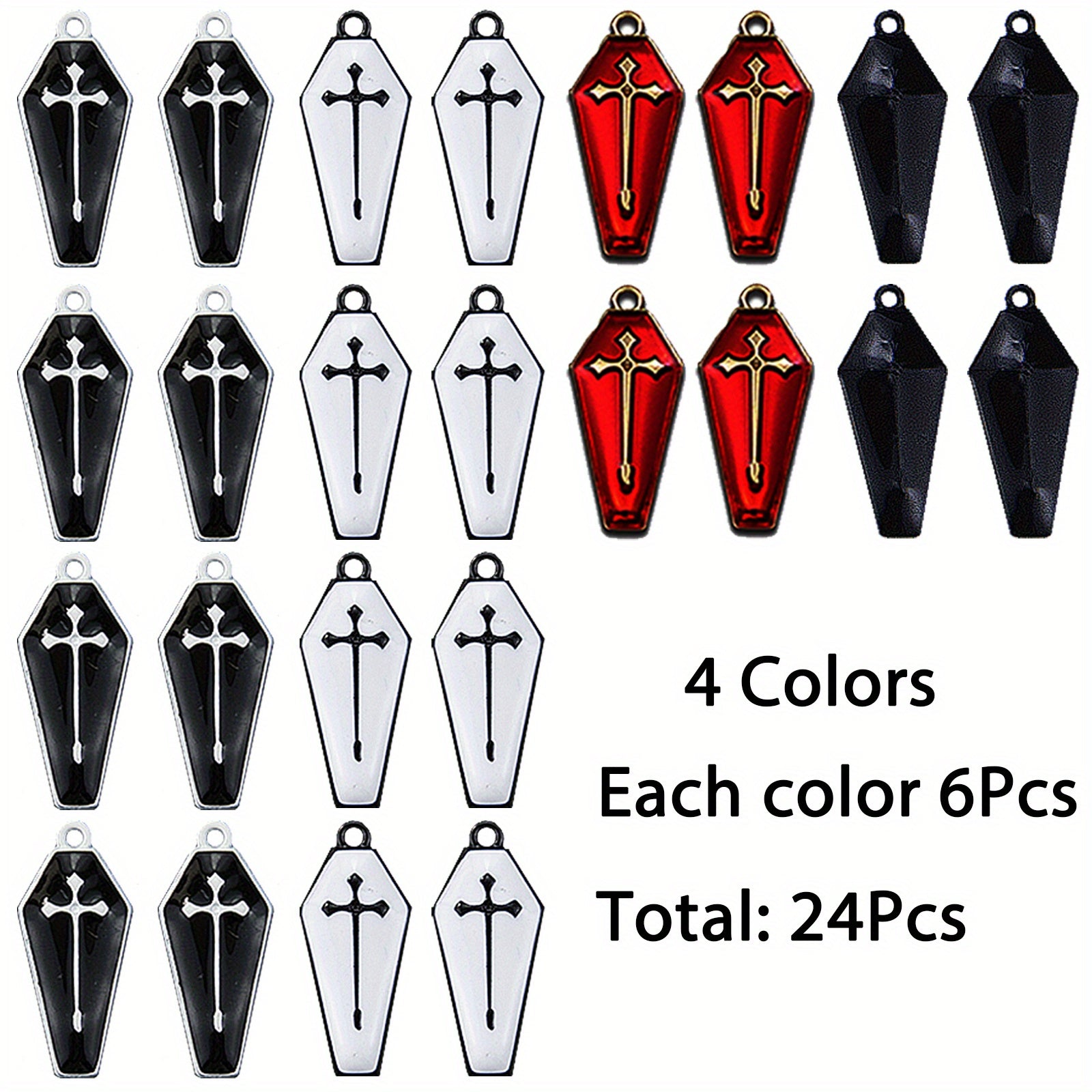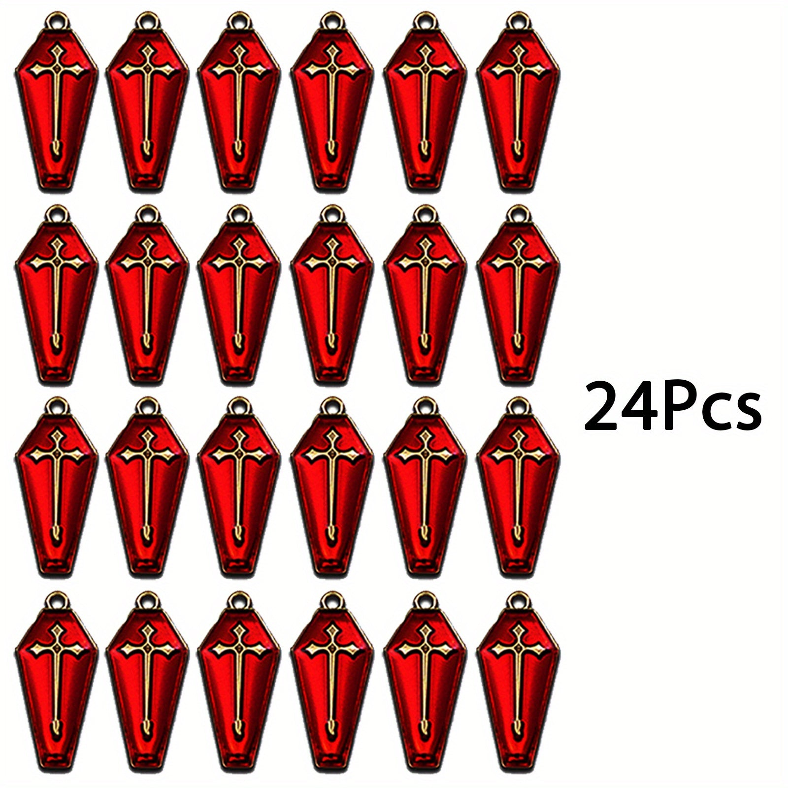 Get into the spooky spirit with this set of 24 Halloween themed coffin charms featuring a red coffin with cross pattern design. Perfect for creating unique necklaces, bracelets, and earrings for the Halloween season.