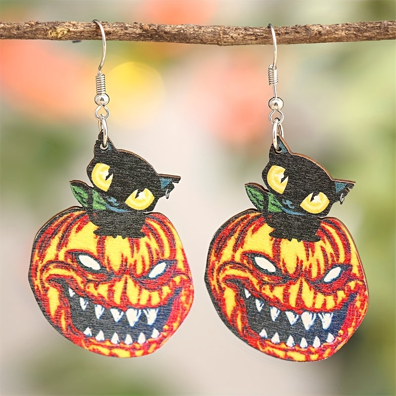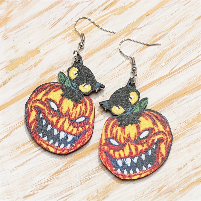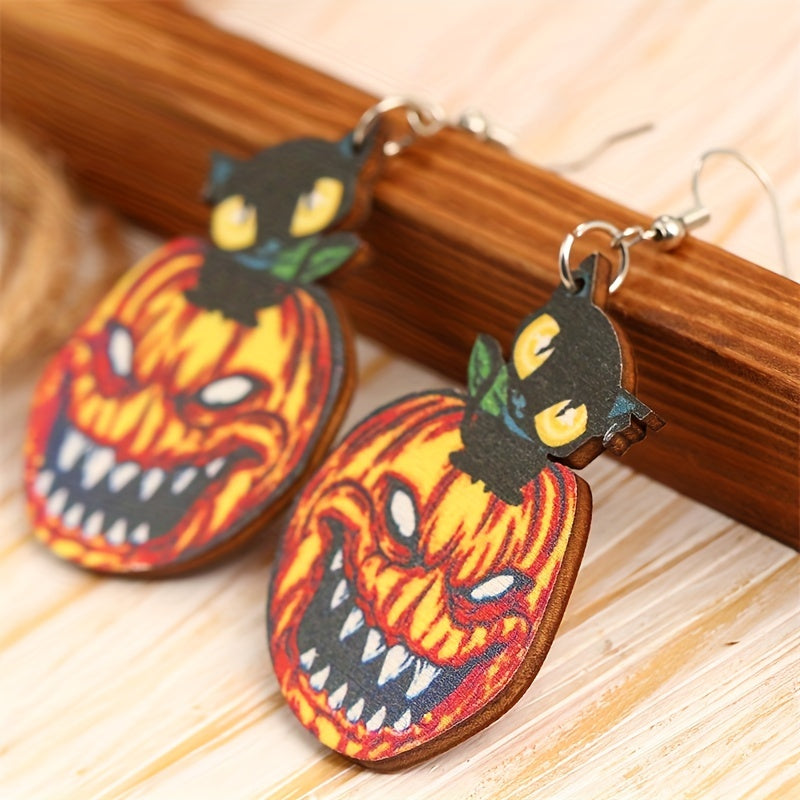Elevate your spooky style with these unique wooden earrings featuring pumpkins and cats. Perfect for Halloween or any retro punk look.