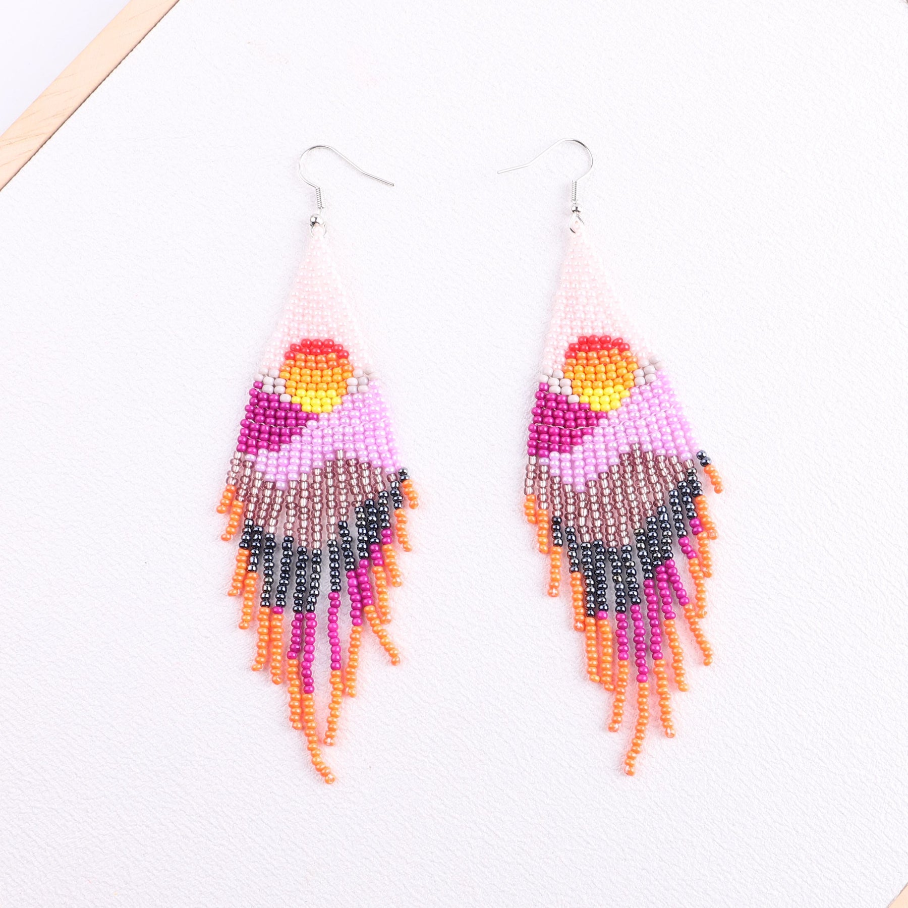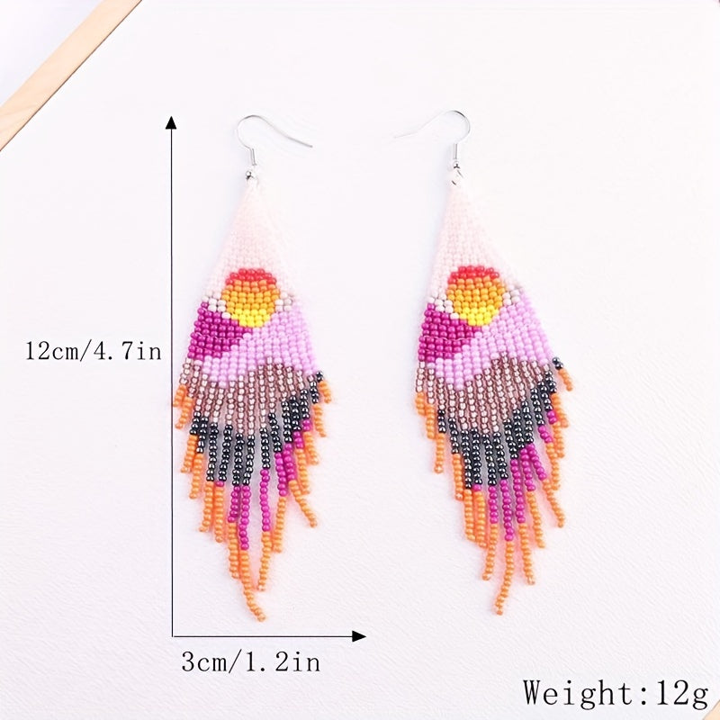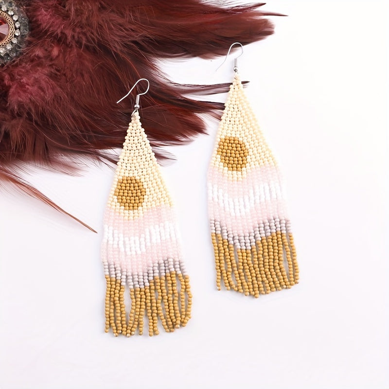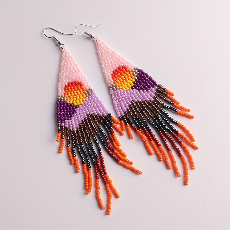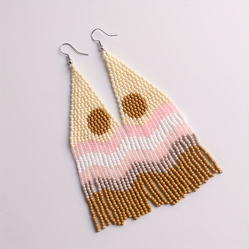 Elevate your look with these unique hand-knitted beaded earrings featuring a bohemian ethnic design and rice bead tassels.