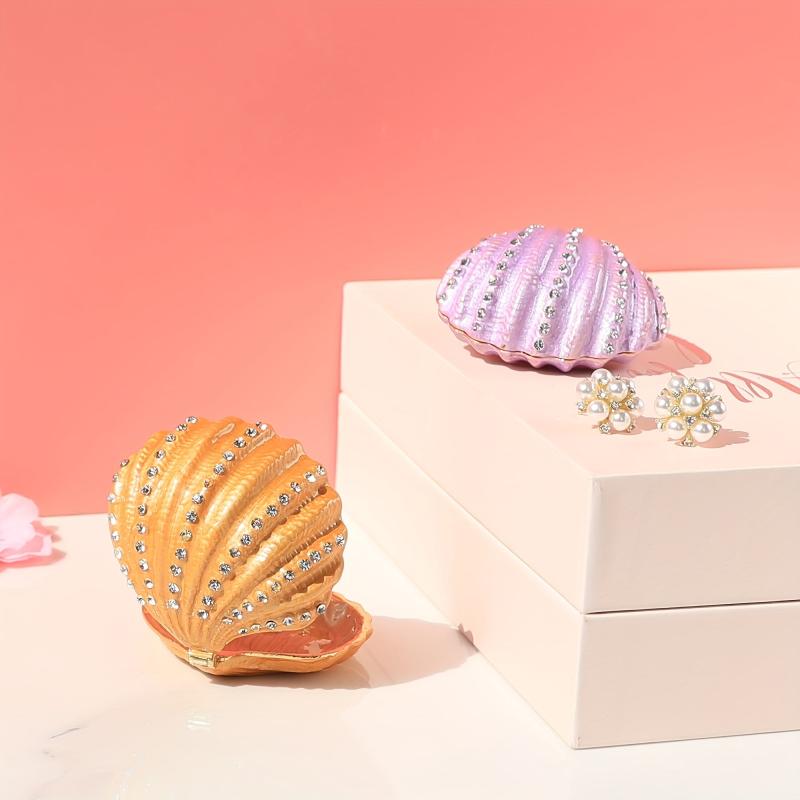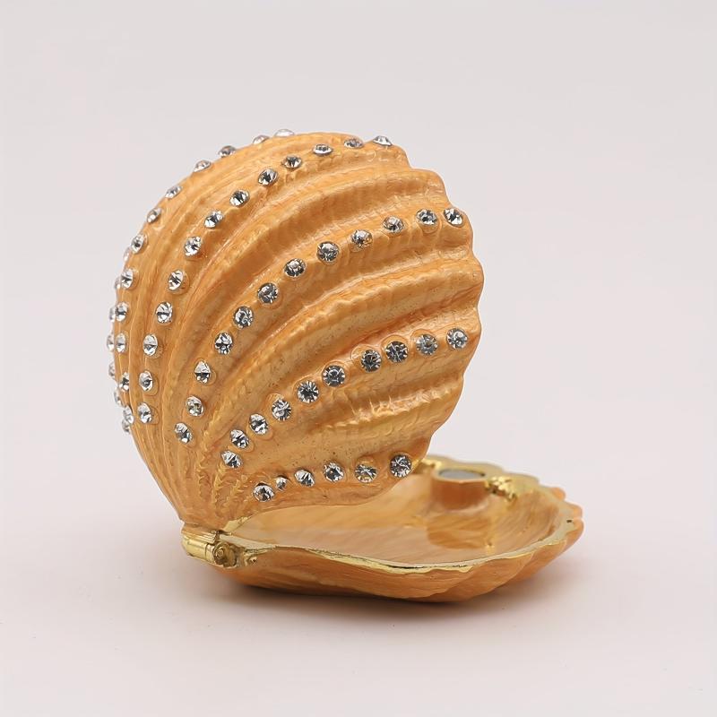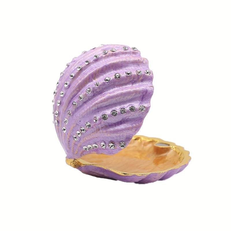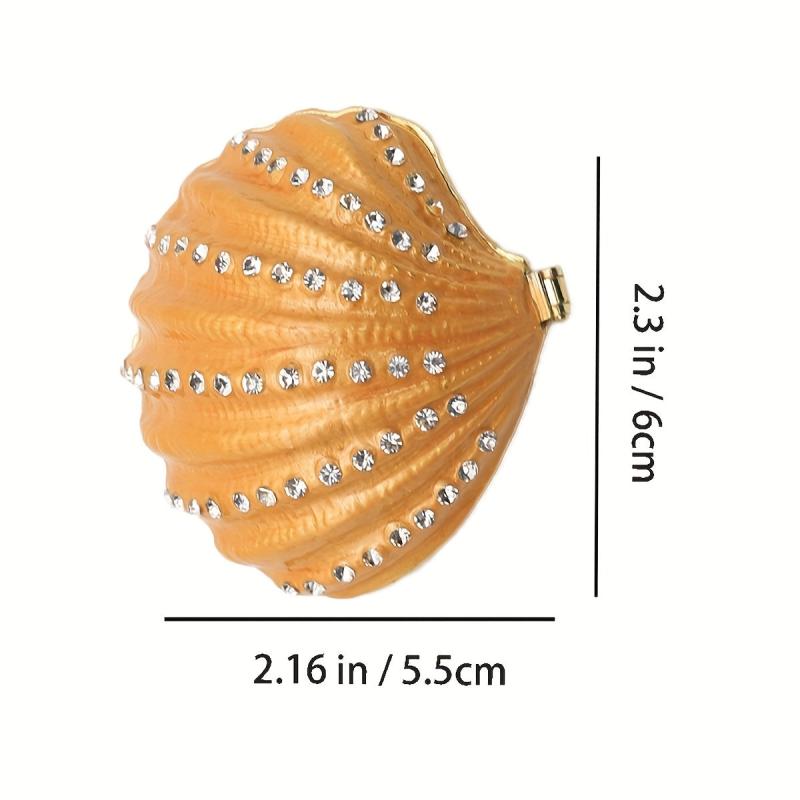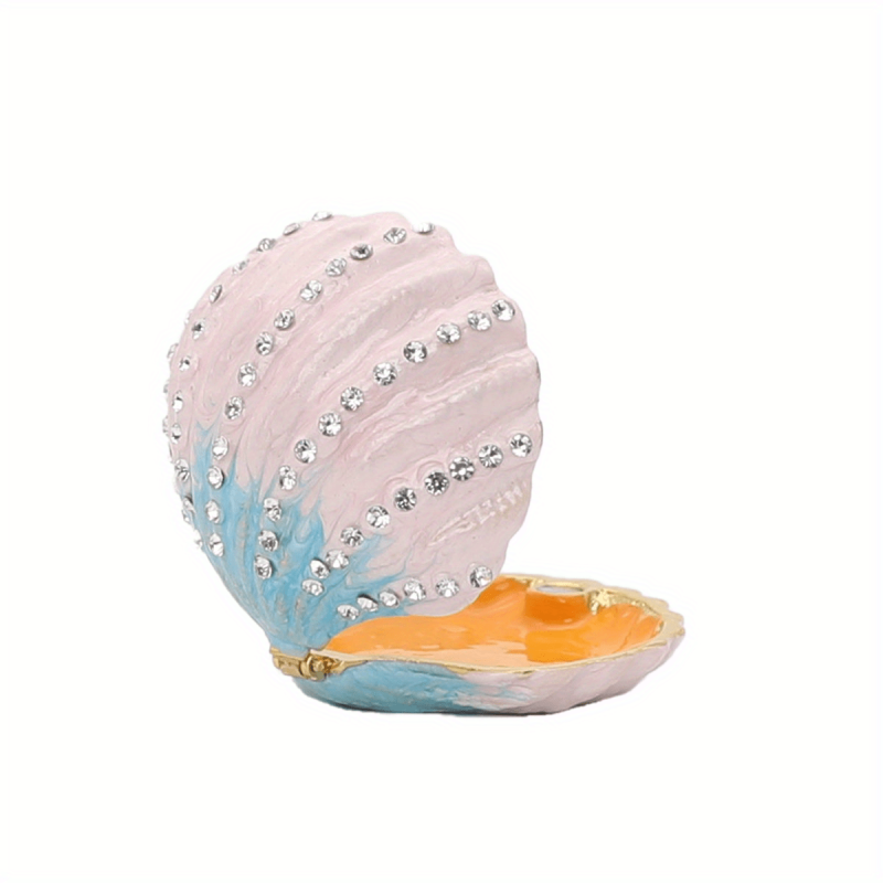 This stunning jewelry box is hand painted with intricate shell designs and adorned with crystals. It has a hinged lid and is perfect for storing your favorite jewelry pieces in style.