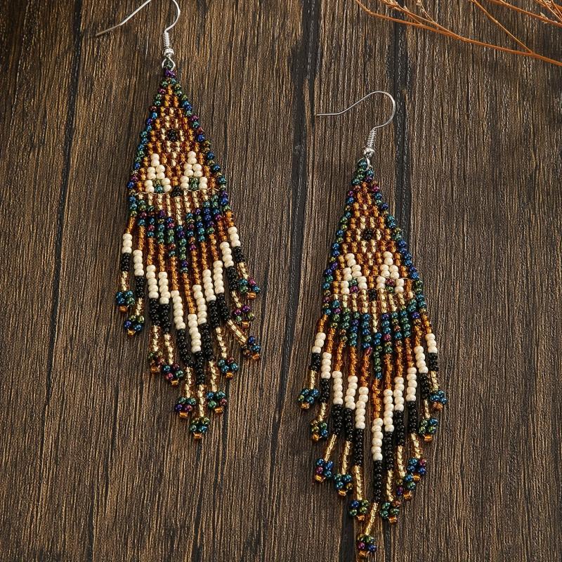 These bohemian fringe earrings are hand woven with vintage multicolor seed beads and feature geometric patterns. They are lightweight, durable, and perfect for everyday wear.