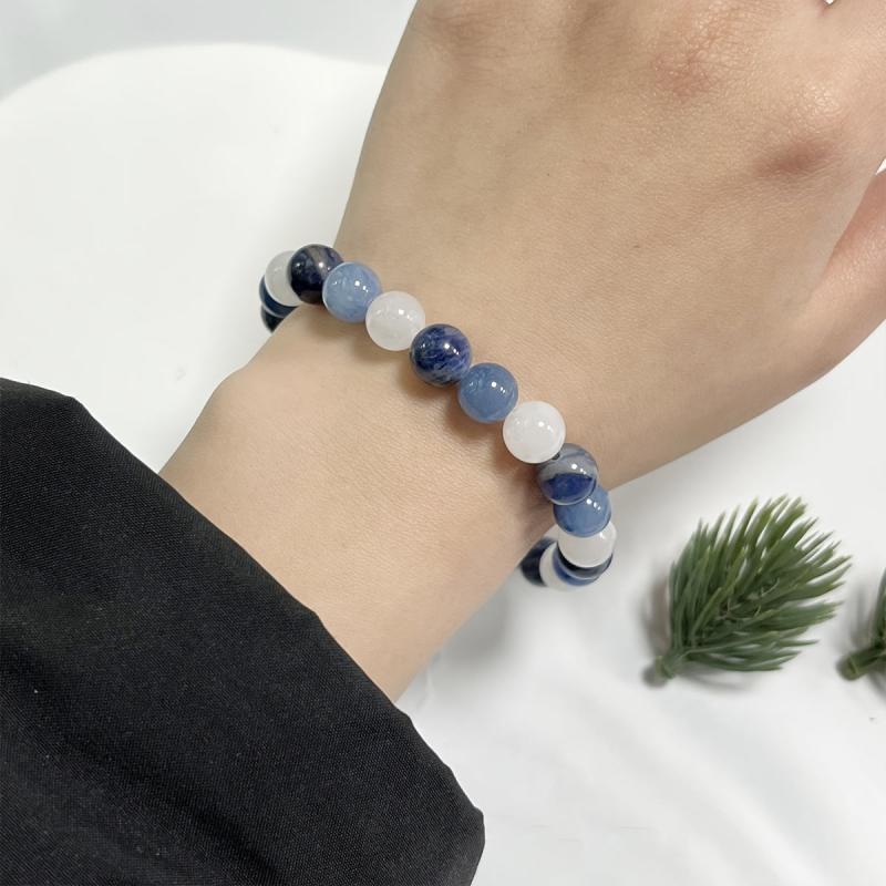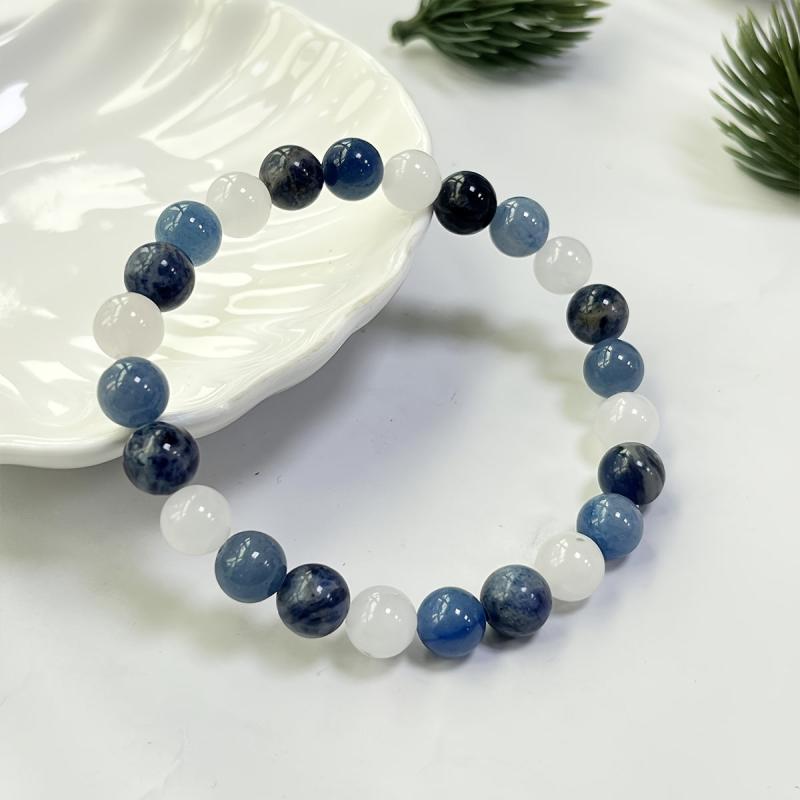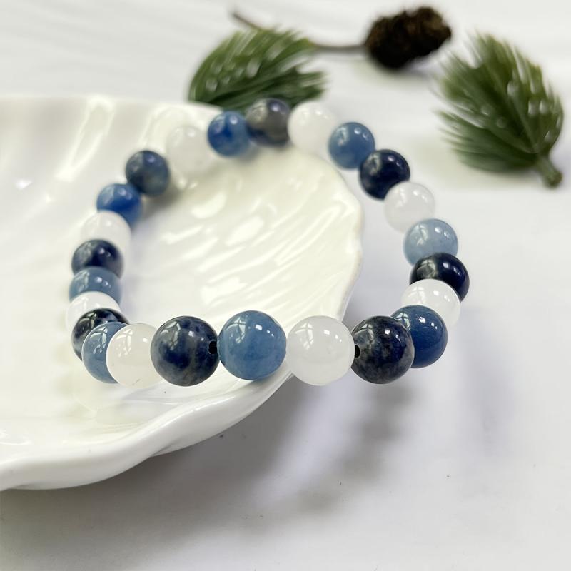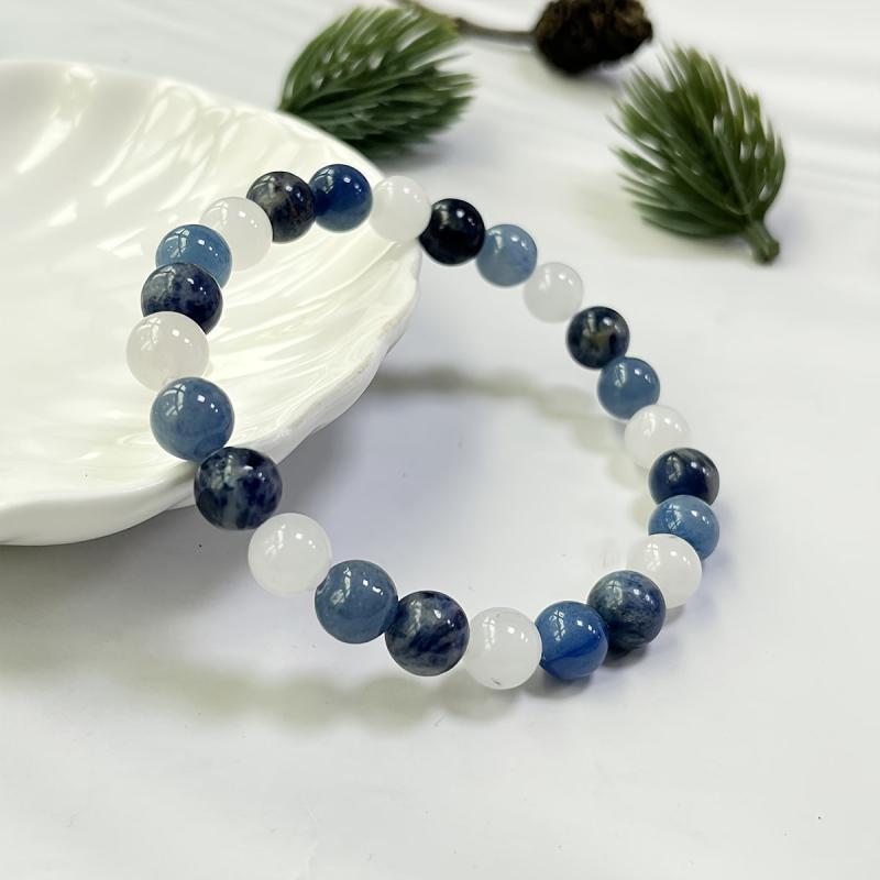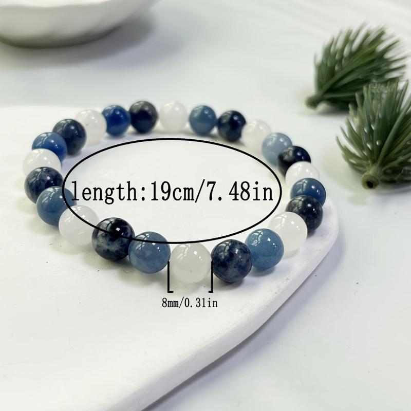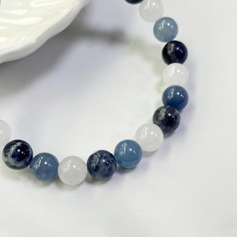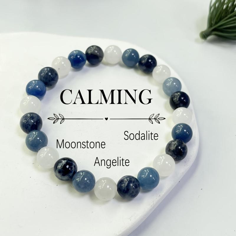 Find inner peace with this stylish unisex bracelet featuring 8mm Moonstone, Sodalite, and Angelite beads. Handcrafted for a soothing and calming effect.