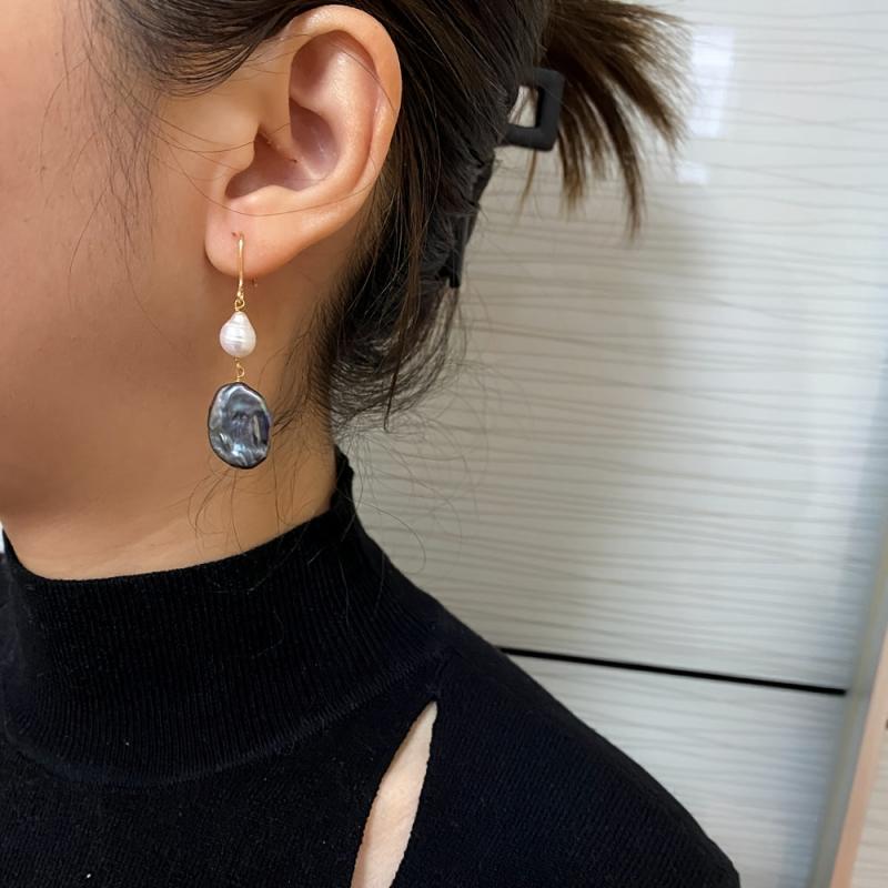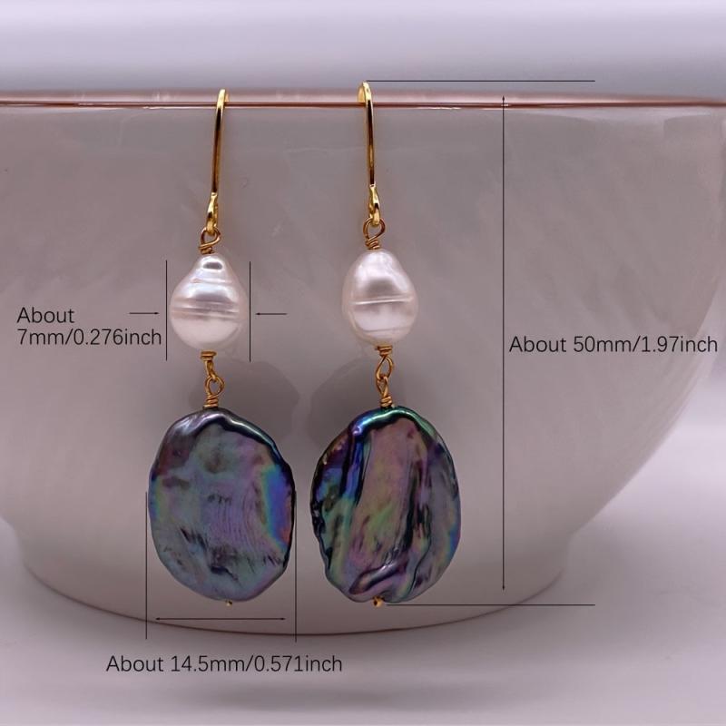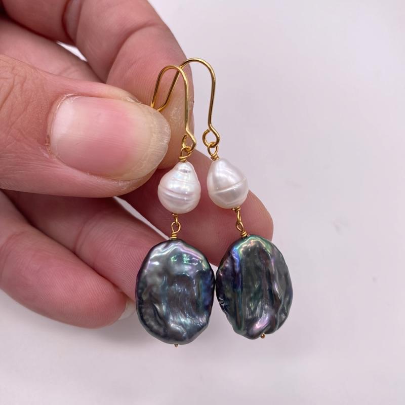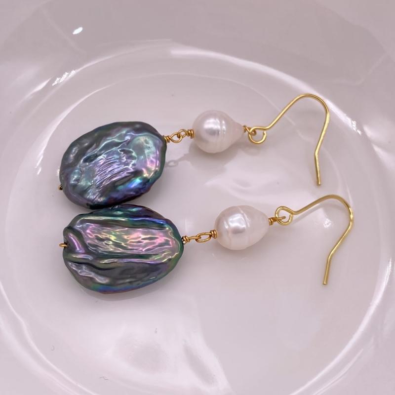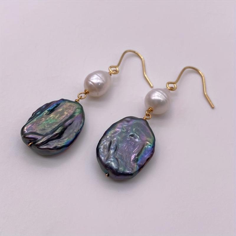These earrings feature natural freshwater baroque pearls in a teardrop and oval shape. They are handcrafted with care to create a unique and elegant accessory.