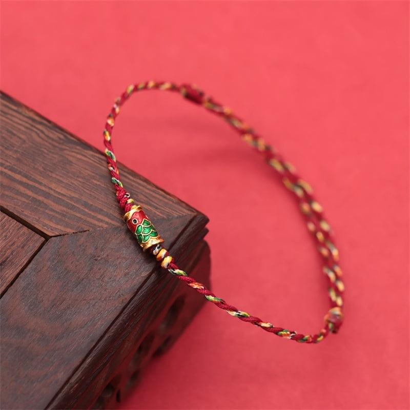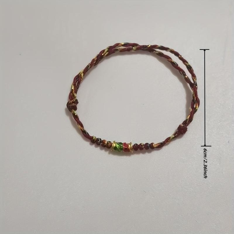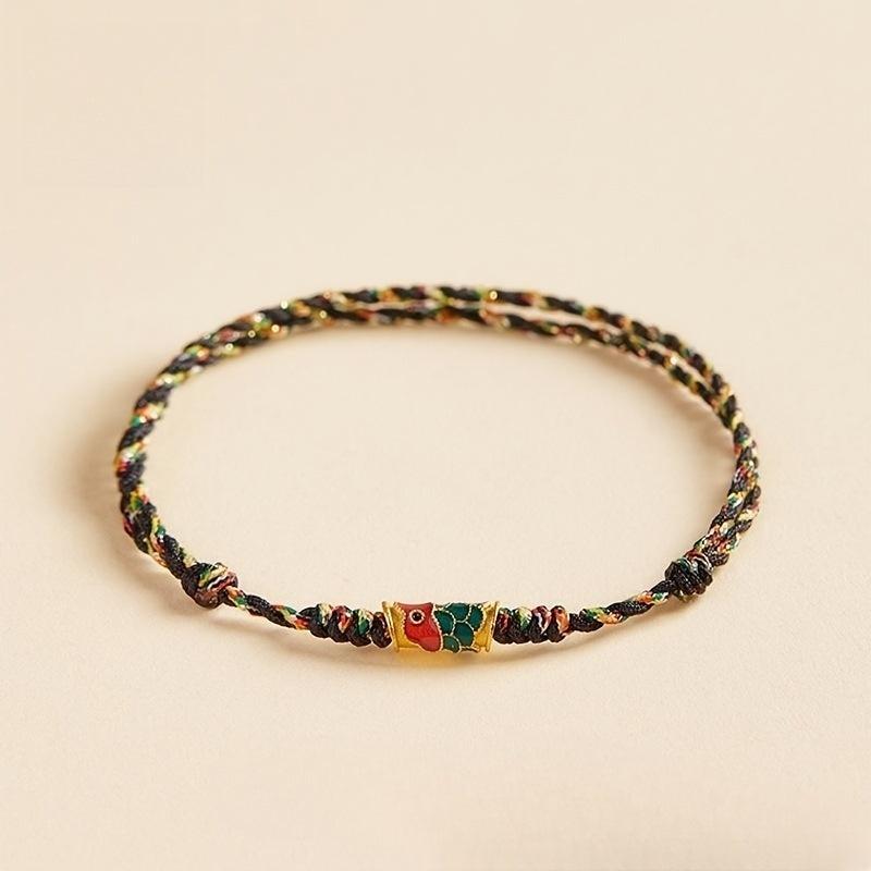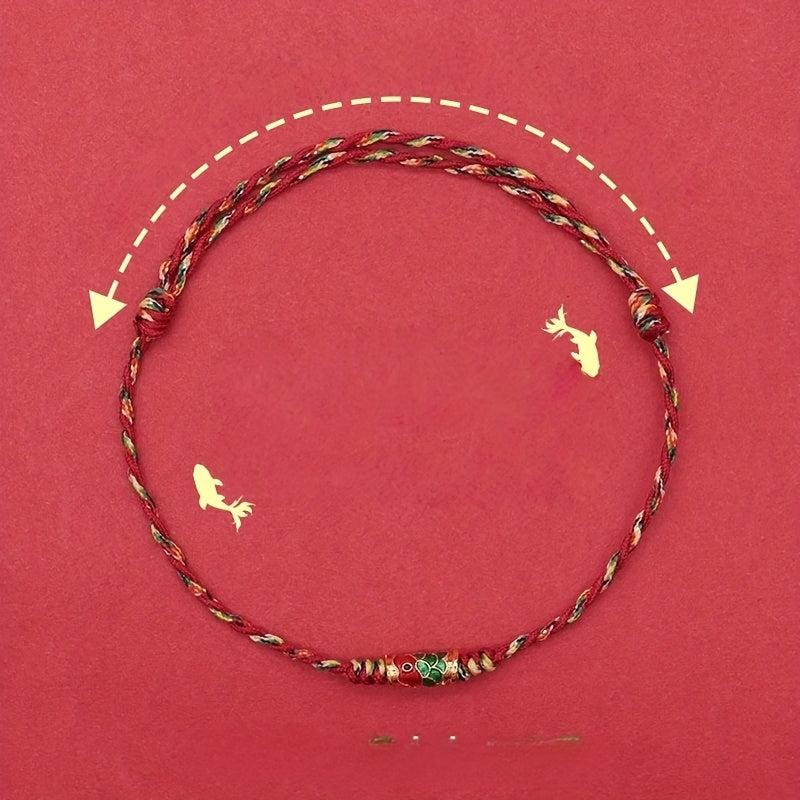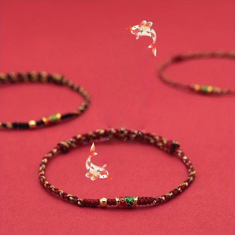 This bracelet features a Chinese-inspired lucky koi design with vibrant red, green, and golden accents. It is made of synthetic stone and can be worn all year round, suitable for December birthstone.