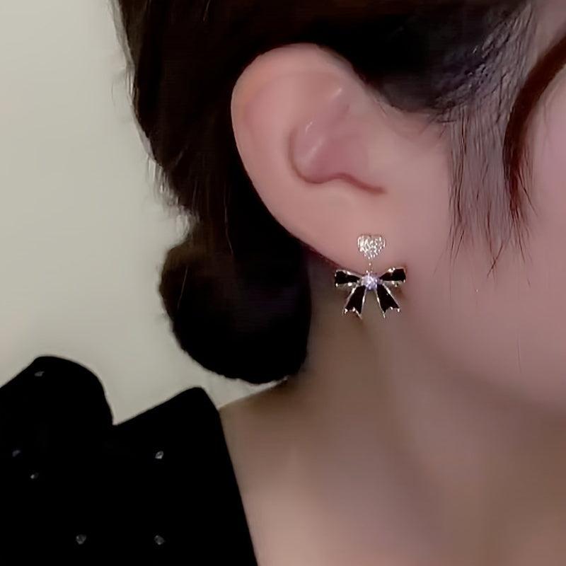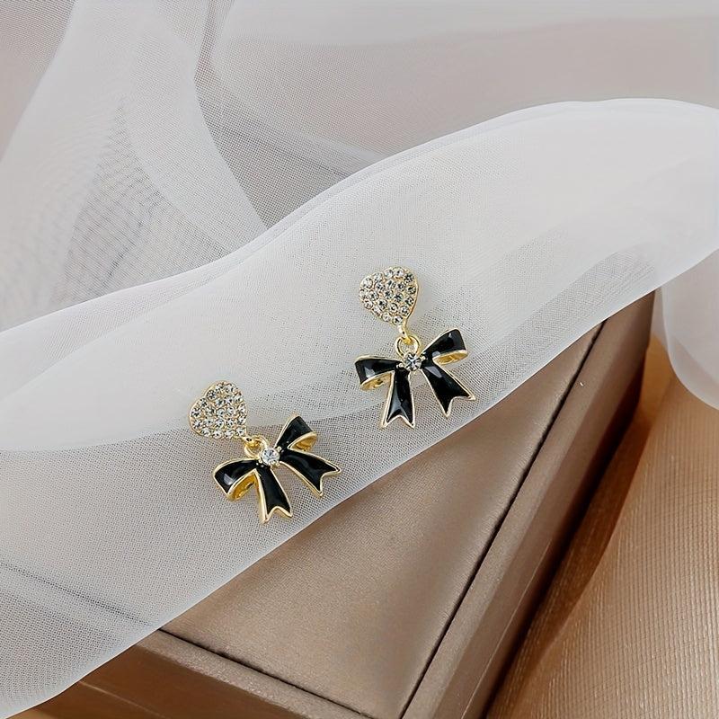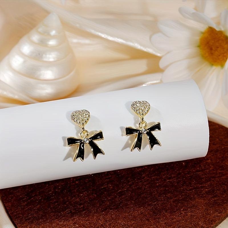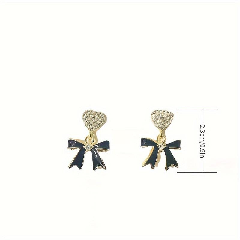 These cute earrings feature heart and bow design with sparkling rhinestones, perfect for casual attire. Alloy construction adds durability and style.