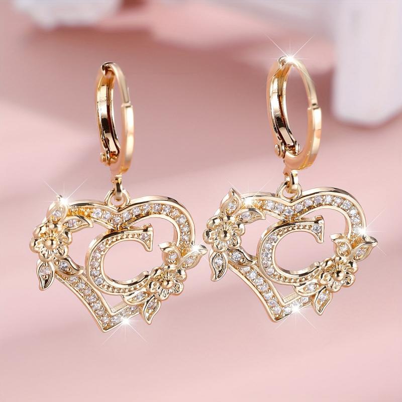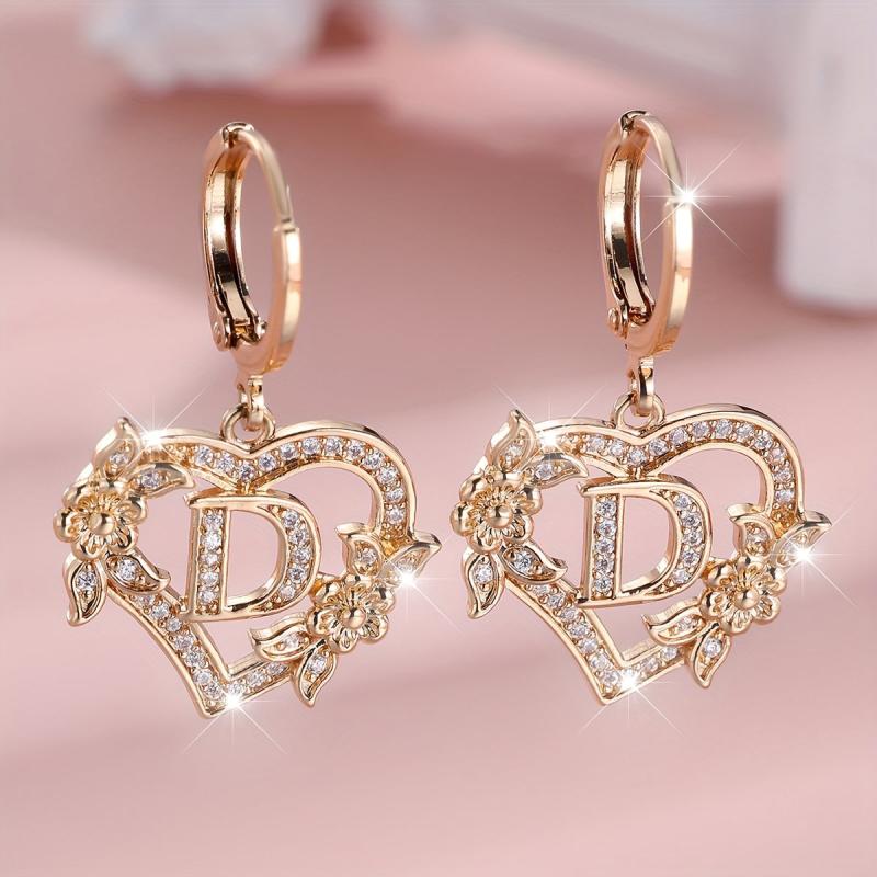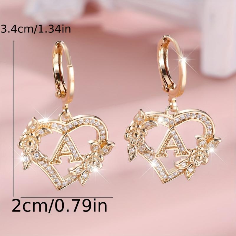 Stunning cubic zirconia heart drop earrings featuring letter engraving, perfect for women. These earrings are made of synthetic zirconia with copper ear needles and a floral design.