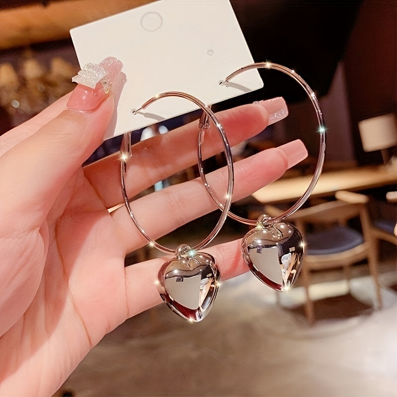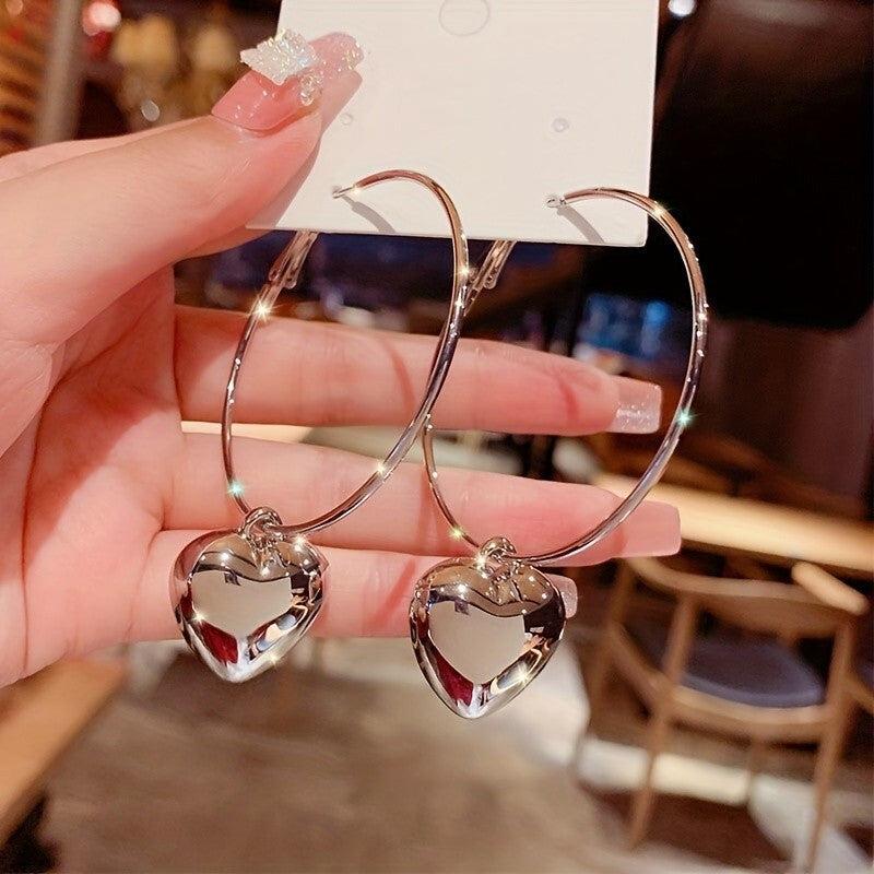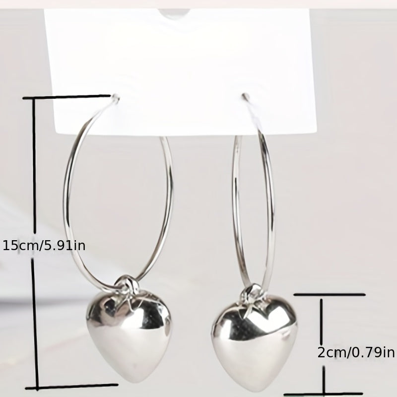 These stylish earrings feature large round hoops with a three-dimensional heart shape design. Perfect for adding a touch of romance to any outfit.