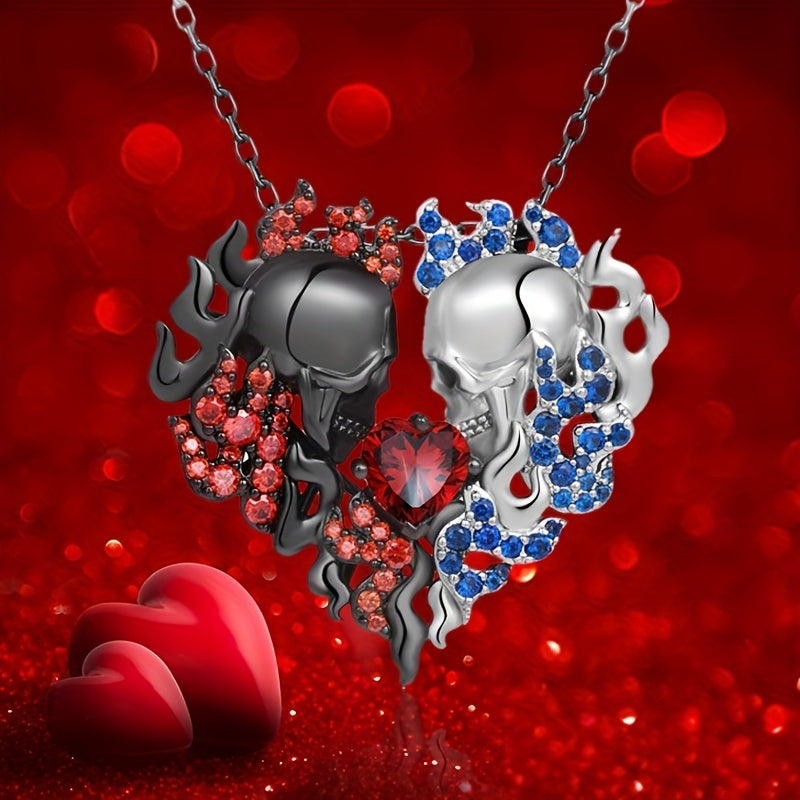 This stunning necklace pair features a half skull pendant with a red heart crystal accent. Perfect gift for wife or girlfriend on Thanksgiving, Christmas, or birthday.