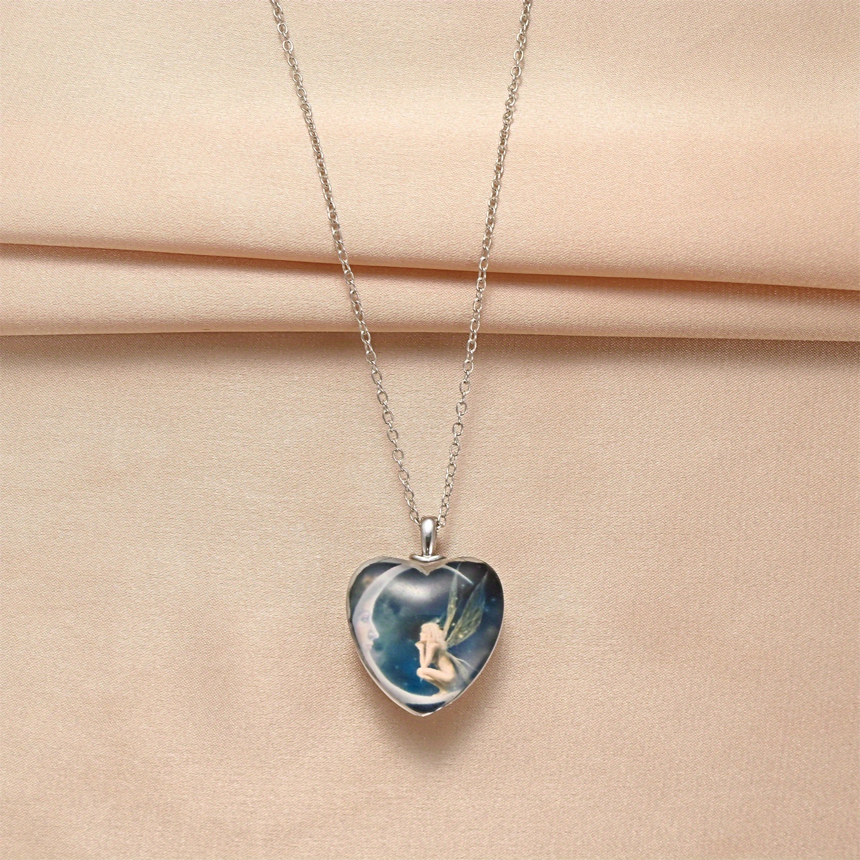 This zinc alloy pendant necklace features a creative design with a heart, crystal moon, and elf charm. Suitable for men, women, couples, or as party decoration.