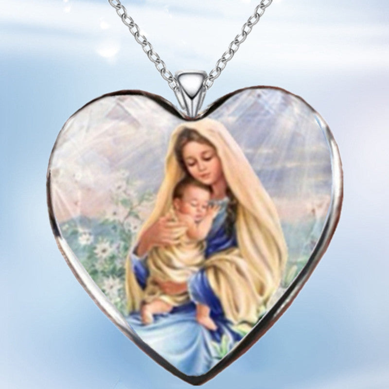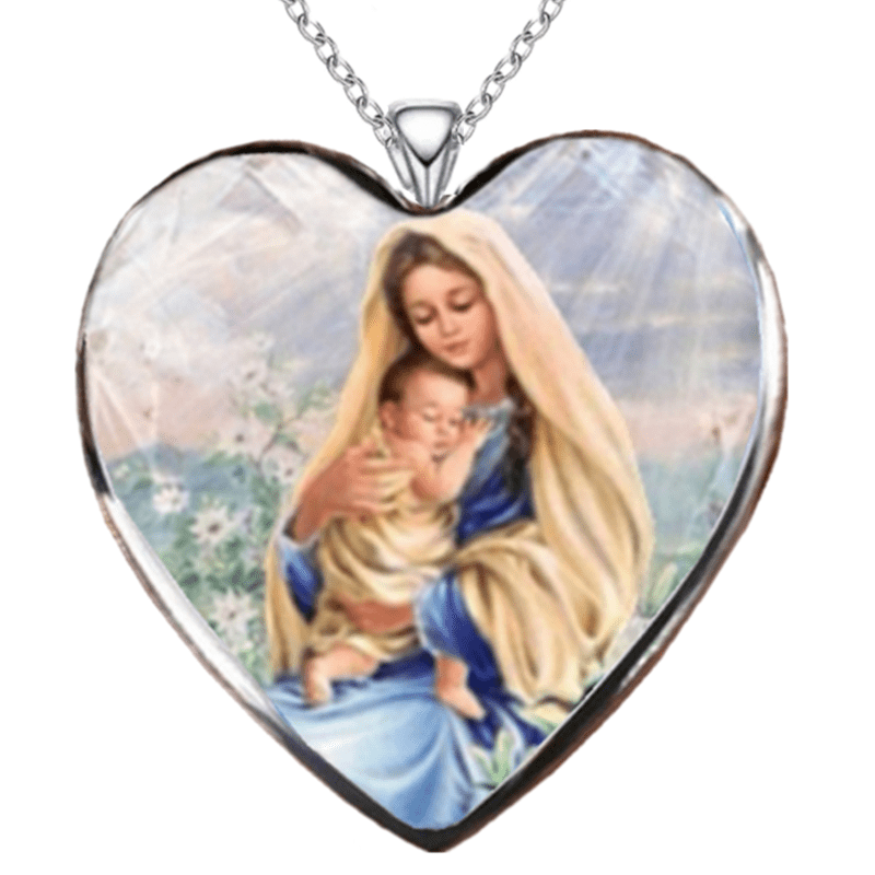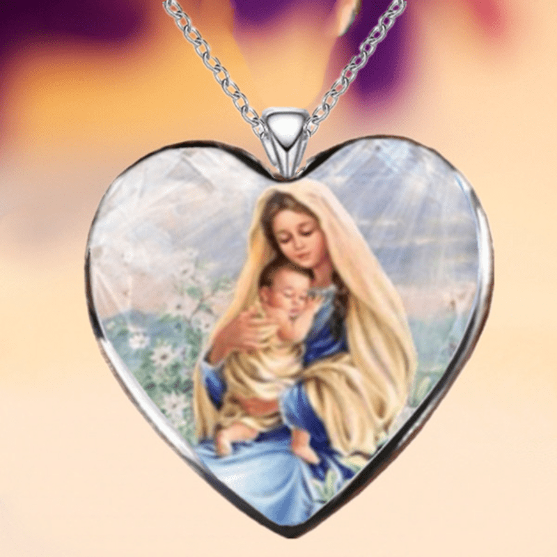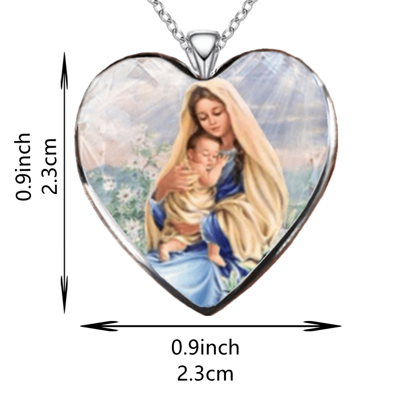 This classic heart pendant necklace featuring Virgin Mary is a perfect gift for birthdays and holiday parties.