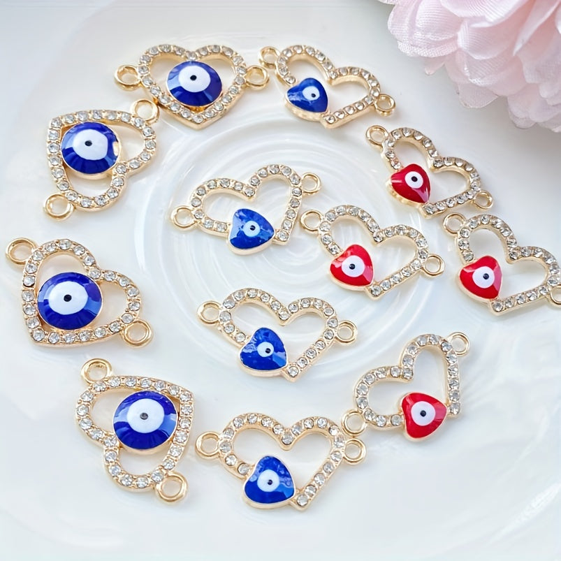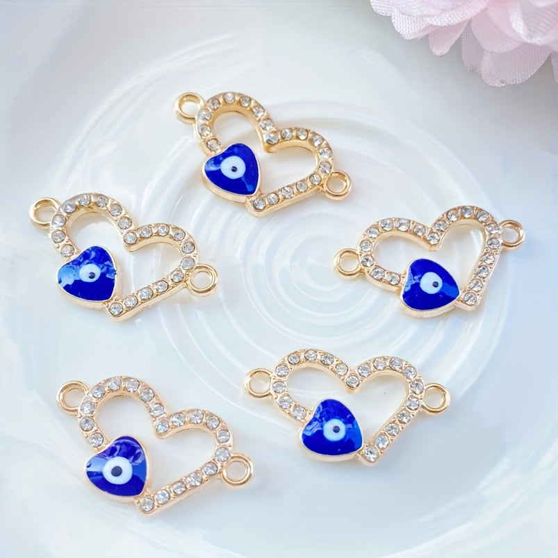 Elegant heart-shaped gold alloy connector adorned with rhinestones and devil eye design. Perfect for creating stunning jewelry pieces.