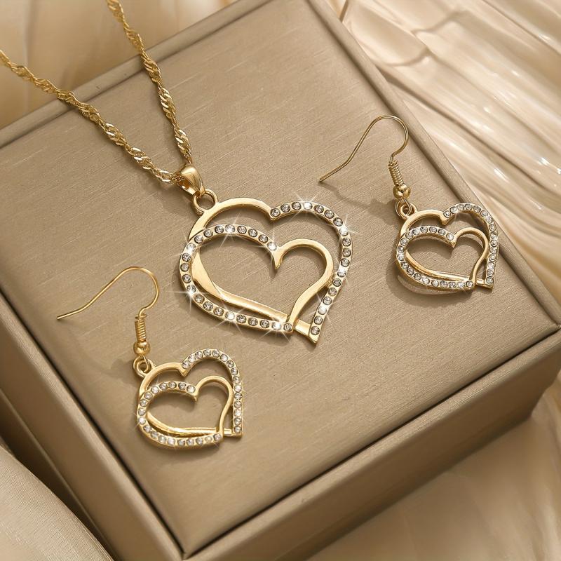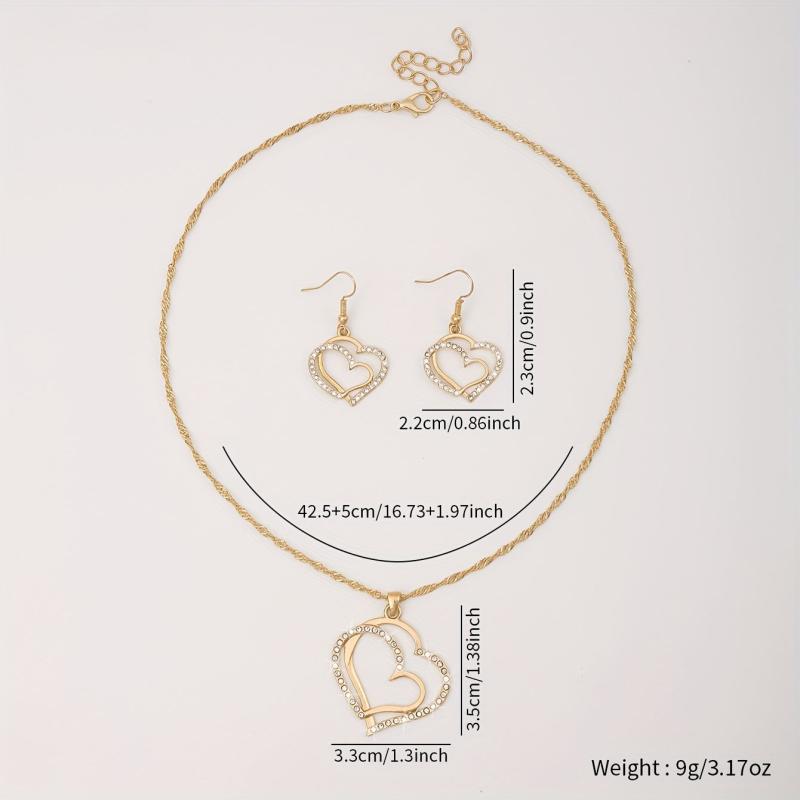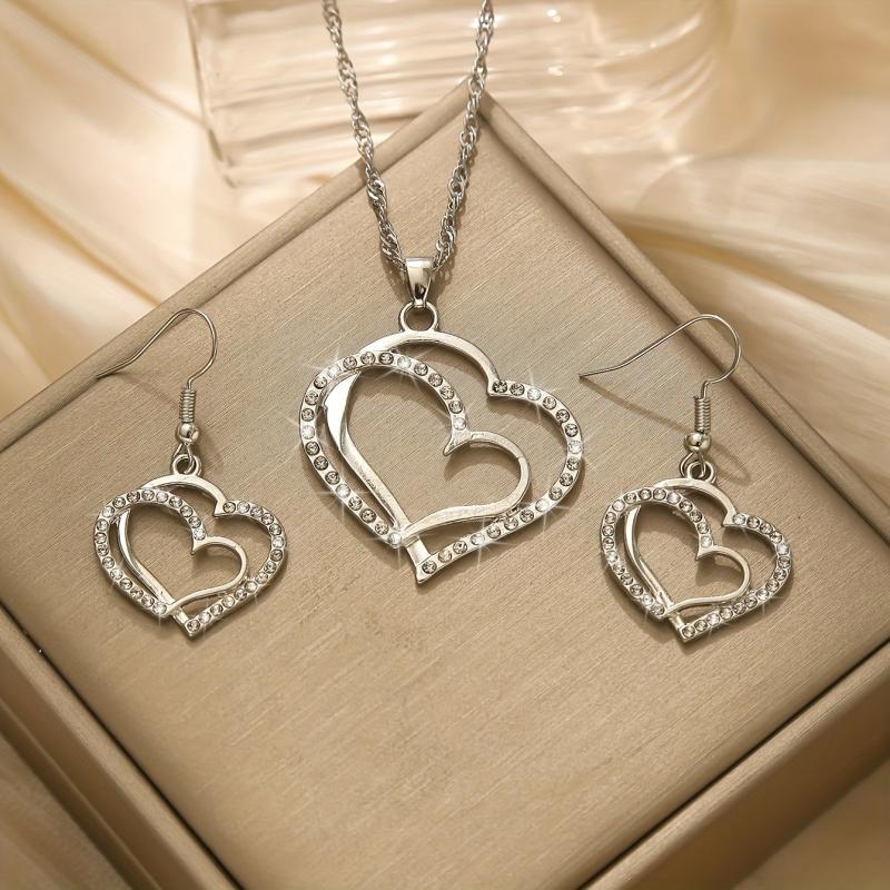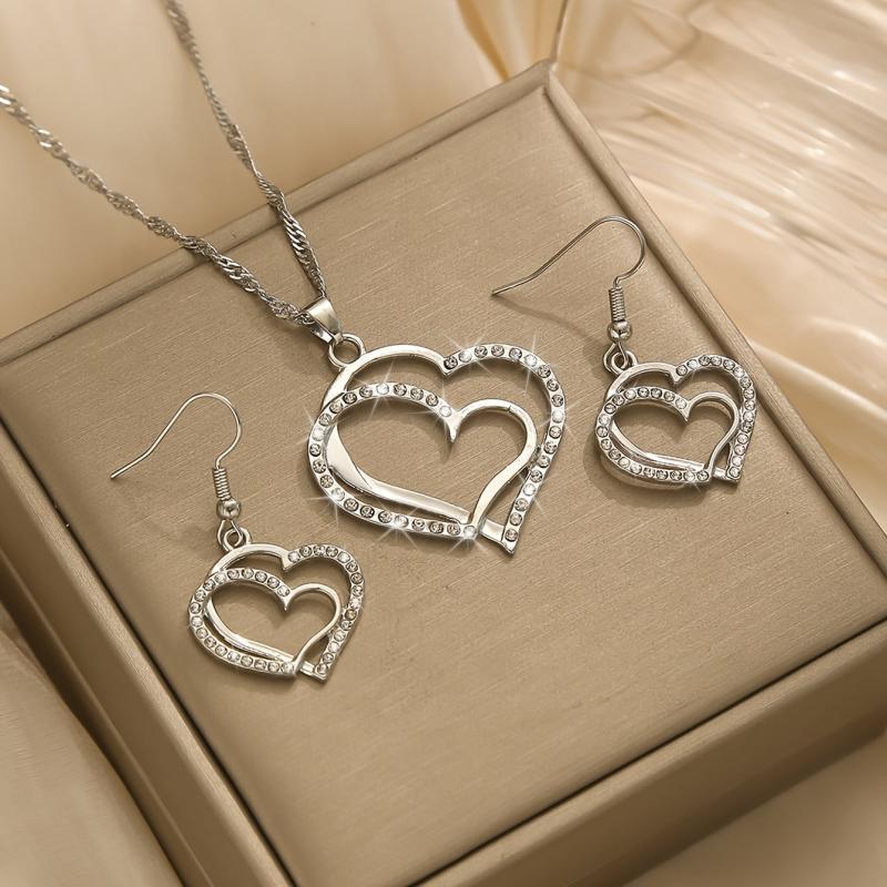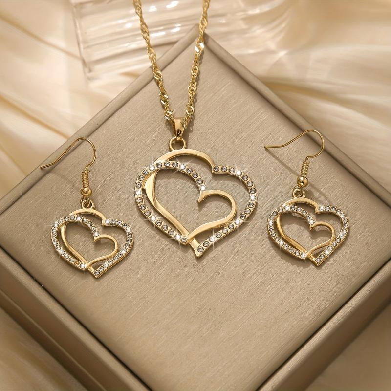 This stylish jewelry set includes 2 earrings and 1 necklace, perfect for daily wear or parties. The heart-shaped design adds a touch of elegance to any outfit.