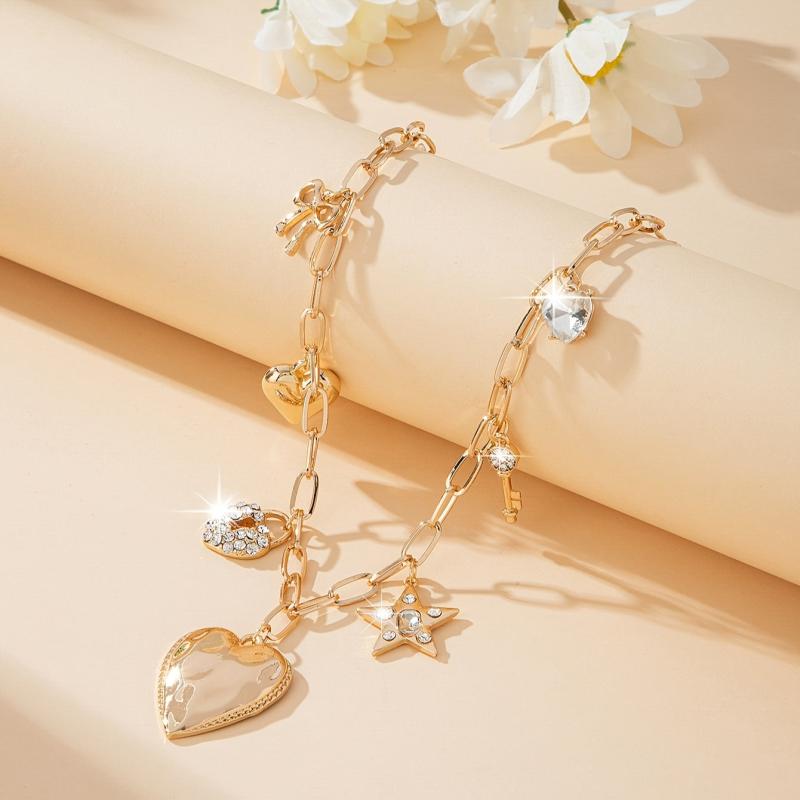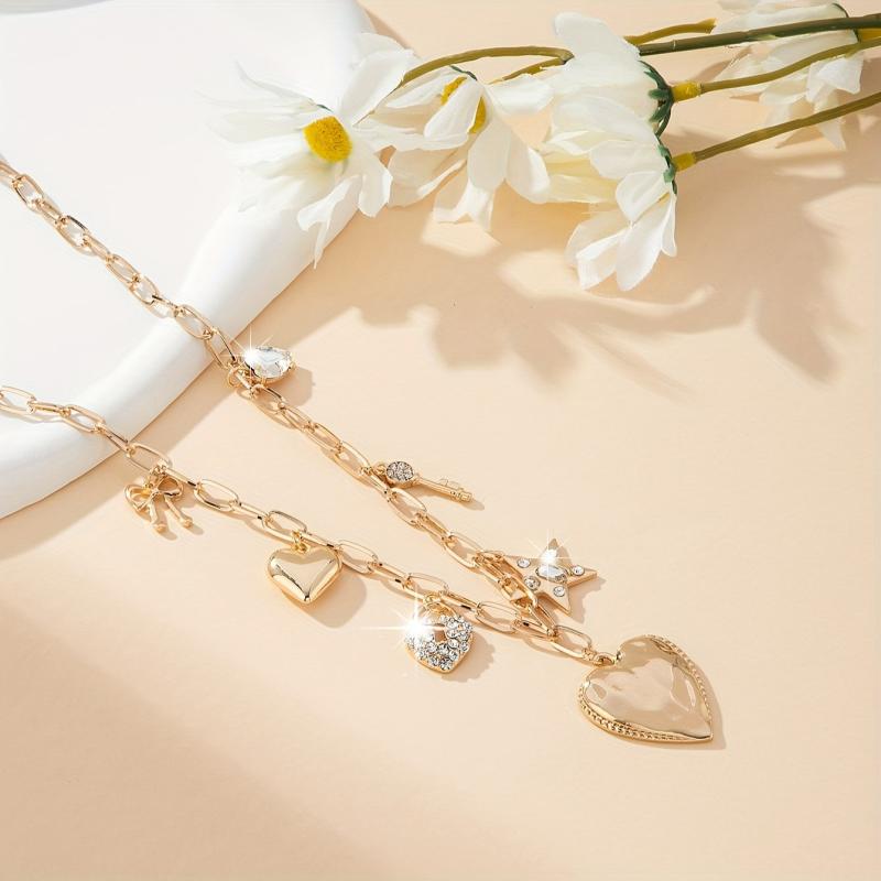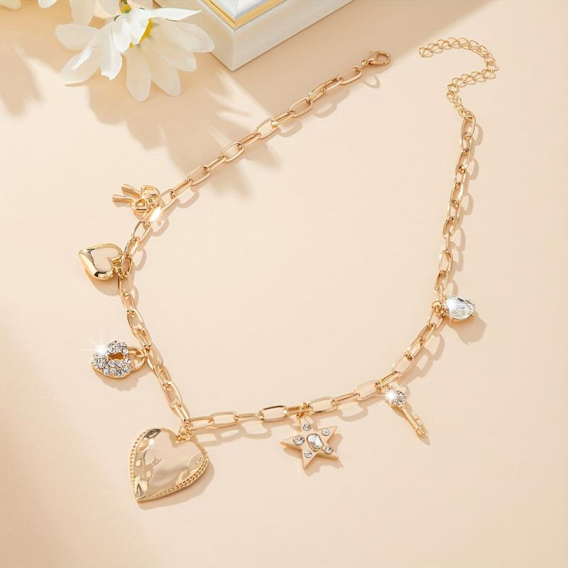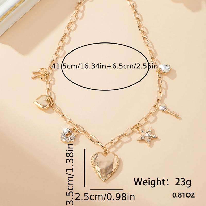 This stylish zinc alloy necklace features rhinestone heart and star charms, making it perfect for Valentine's Day or any party. It's a versatile piece of jewelry suitable for all seasons.