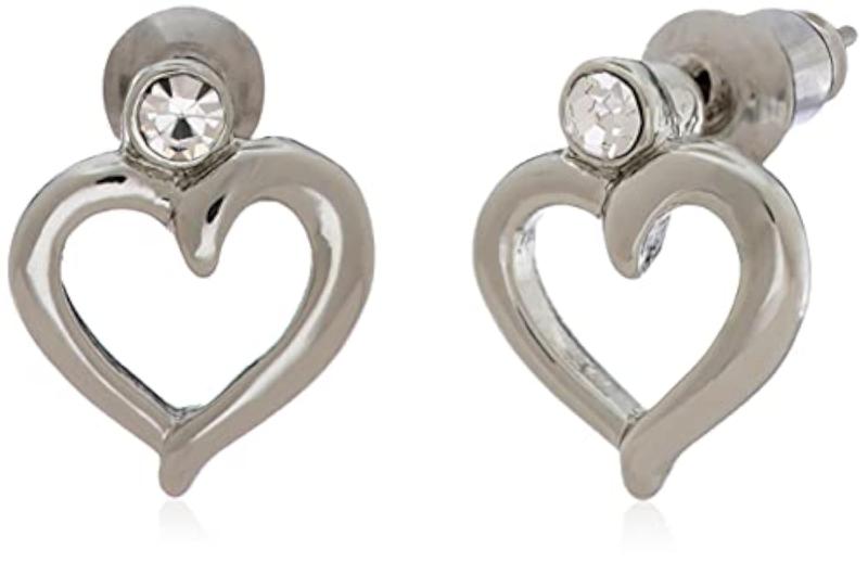Add a touch of sparkle to your ensemble with these rhodium plated heart stud earrings featuring shimmering Austrian crystals.