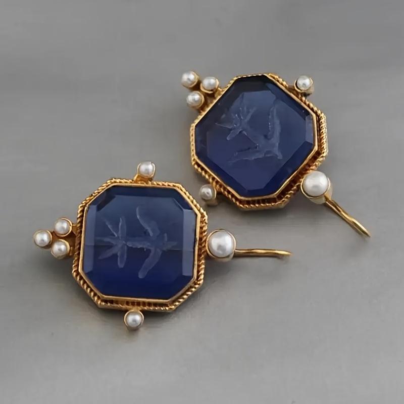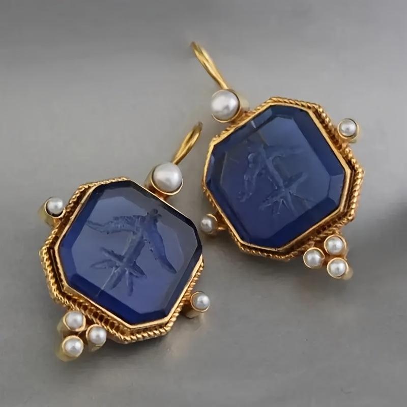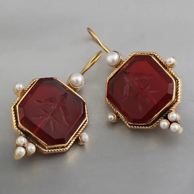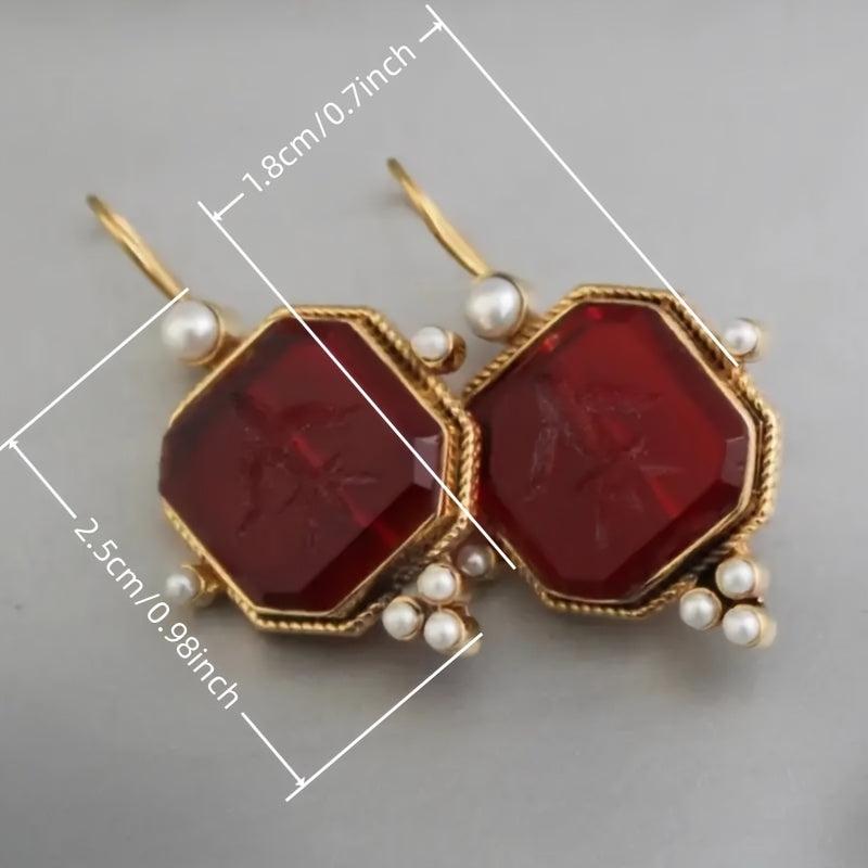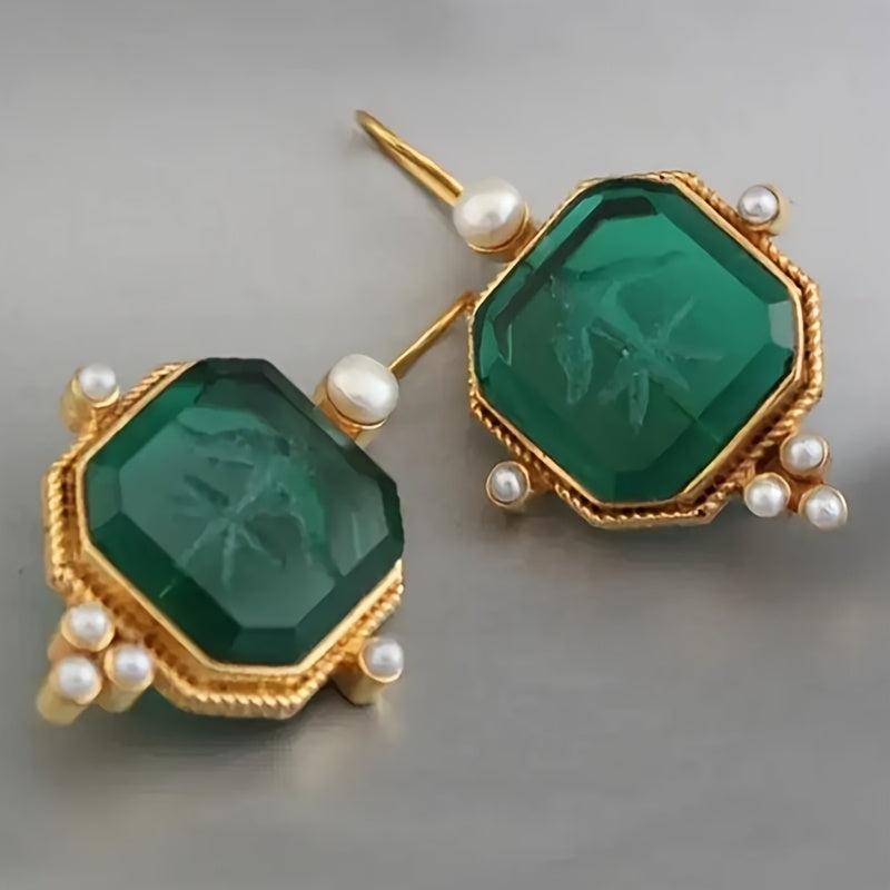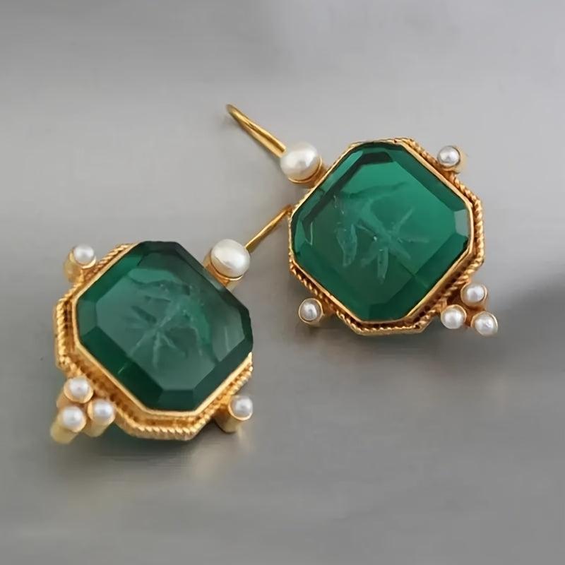 Elegant retro earrings featuring hexagonal green stones carved with intricate details.