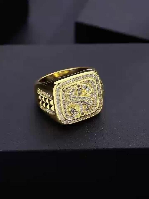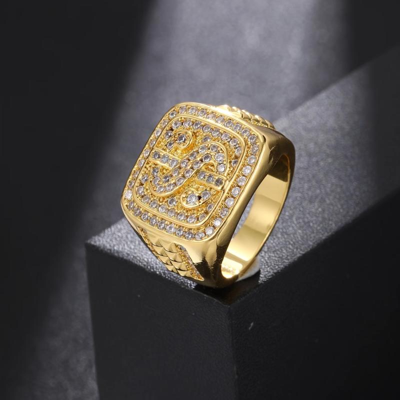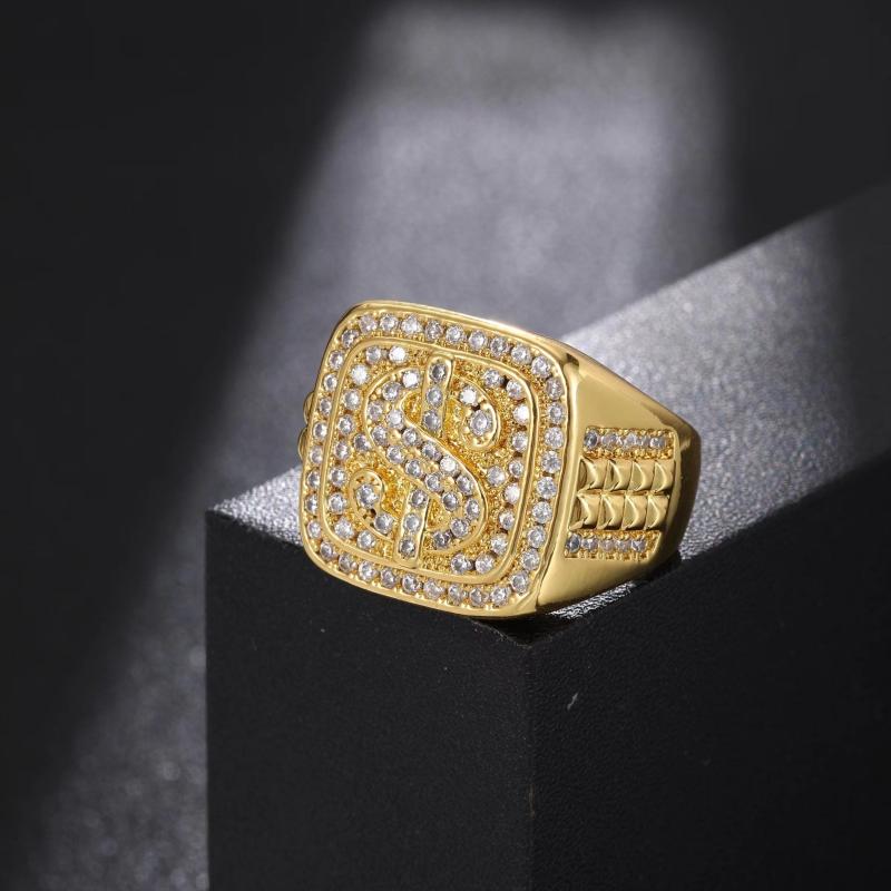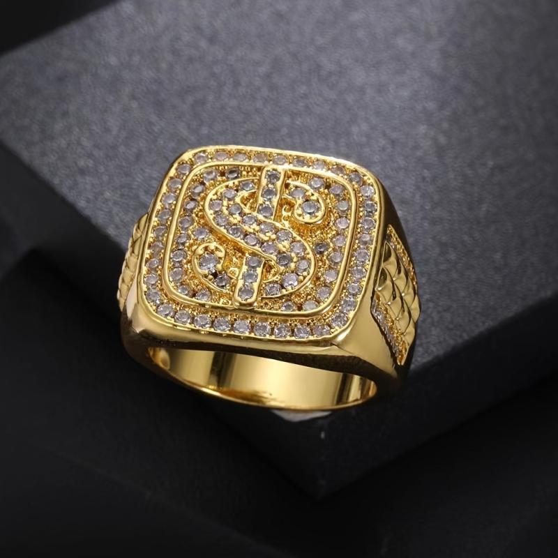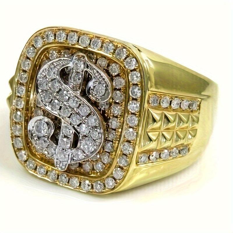 Hip Hop Large Dollar Sign Men's Ring with Zirconia Stones Golden Tone
