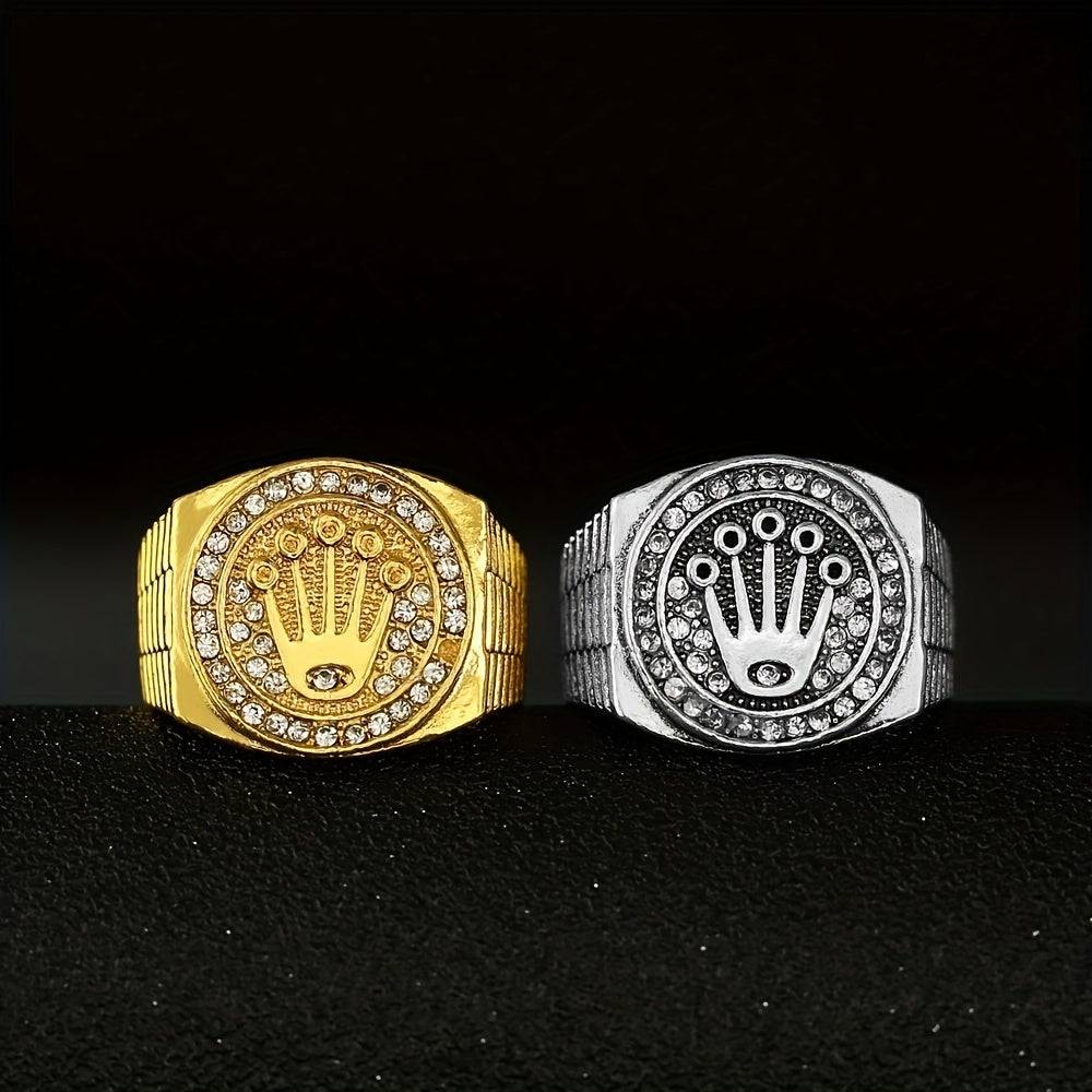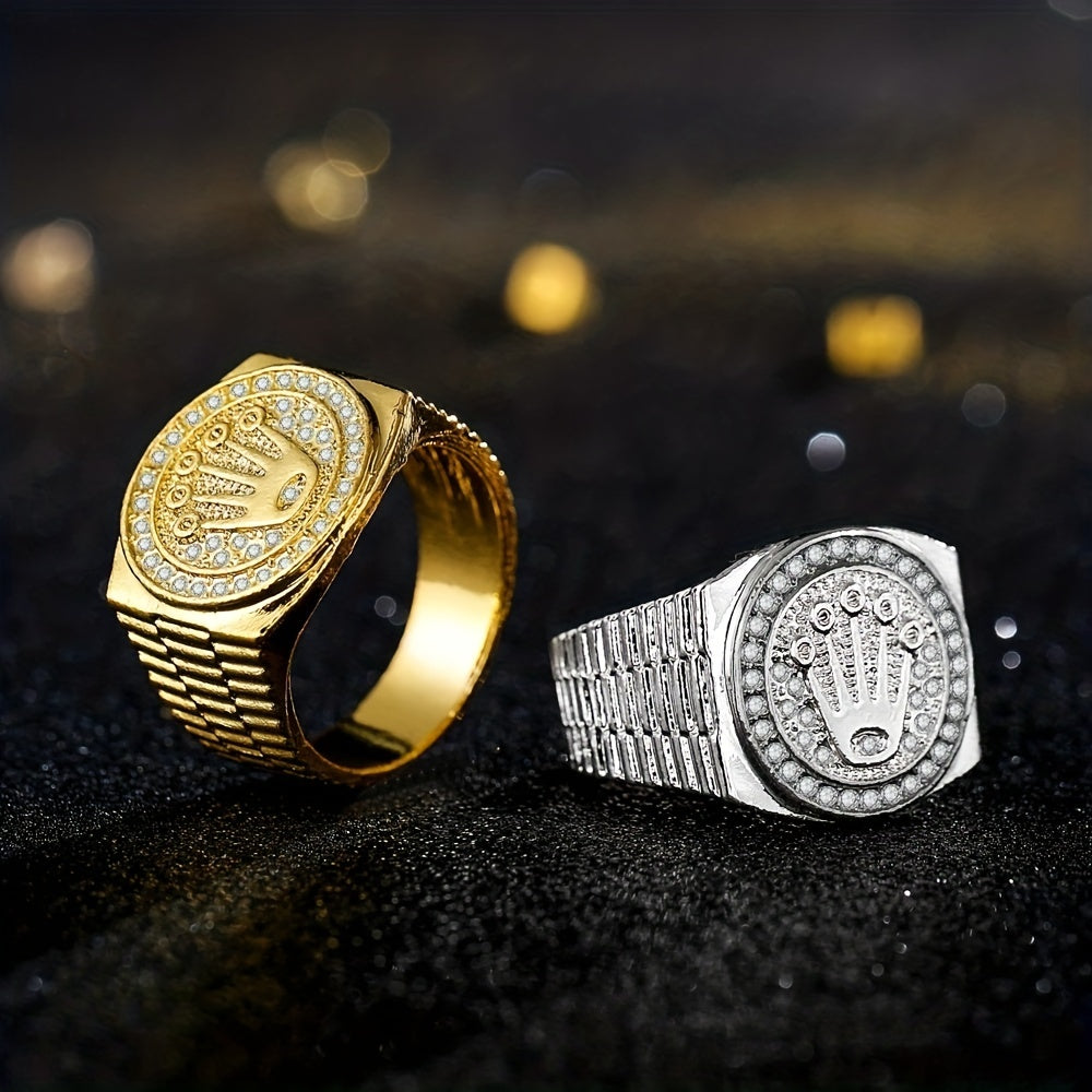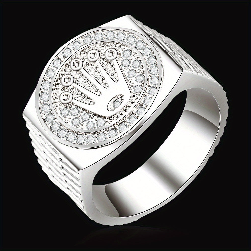 Embrace the hip hop style with this stylish men's ring featuring a palm and crown pattern embellished with dazzling rhinestones.