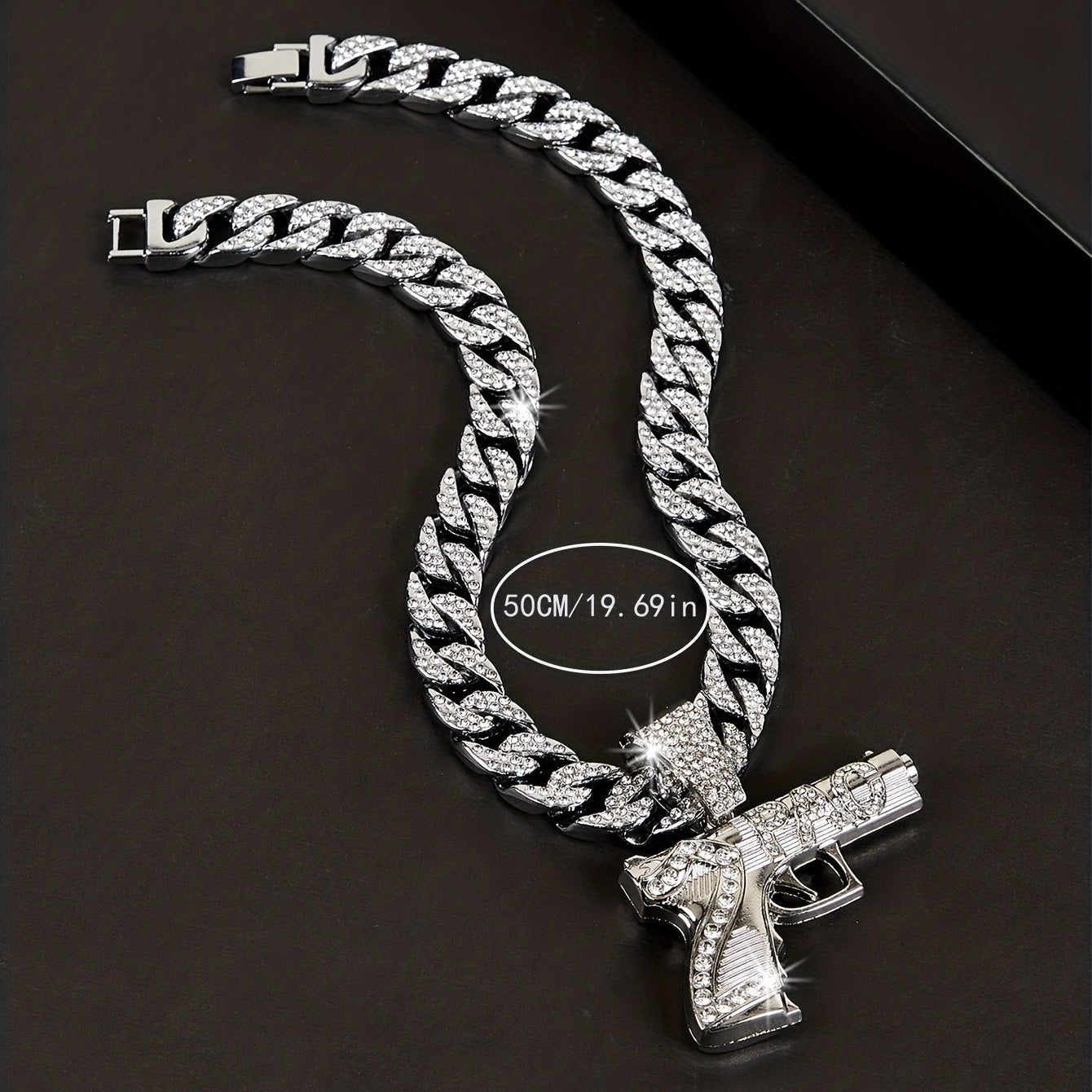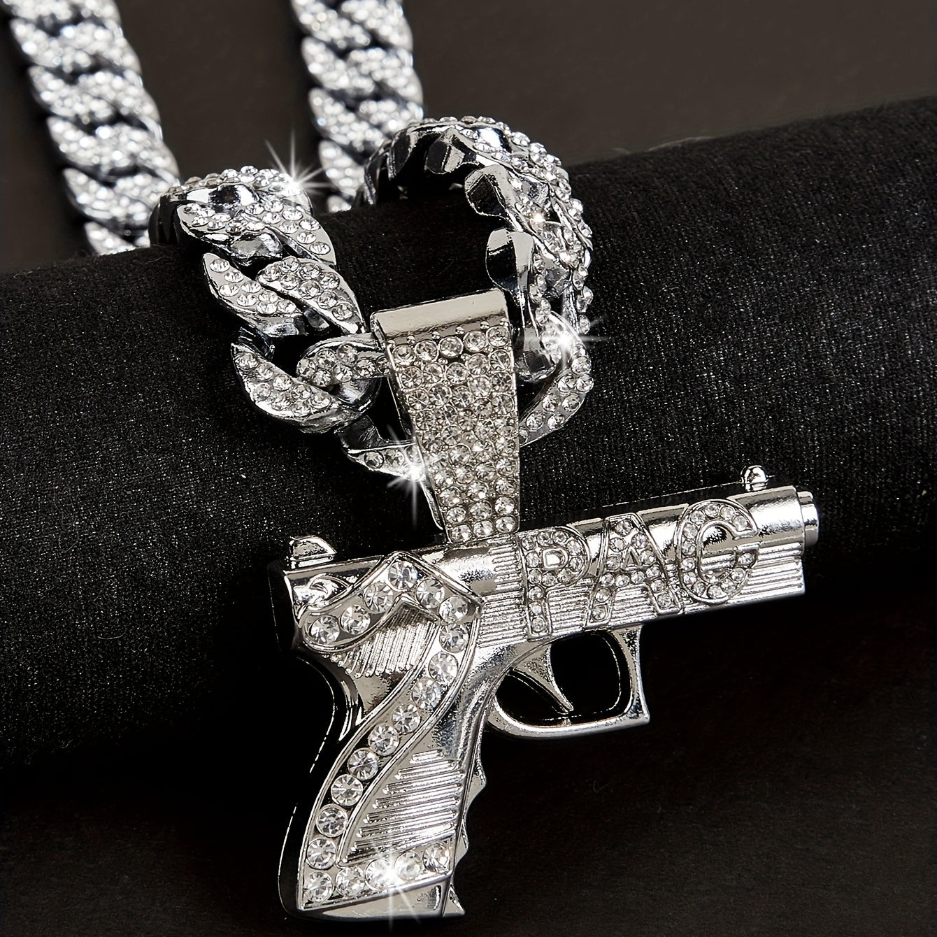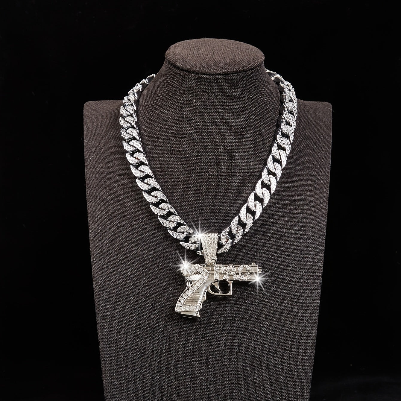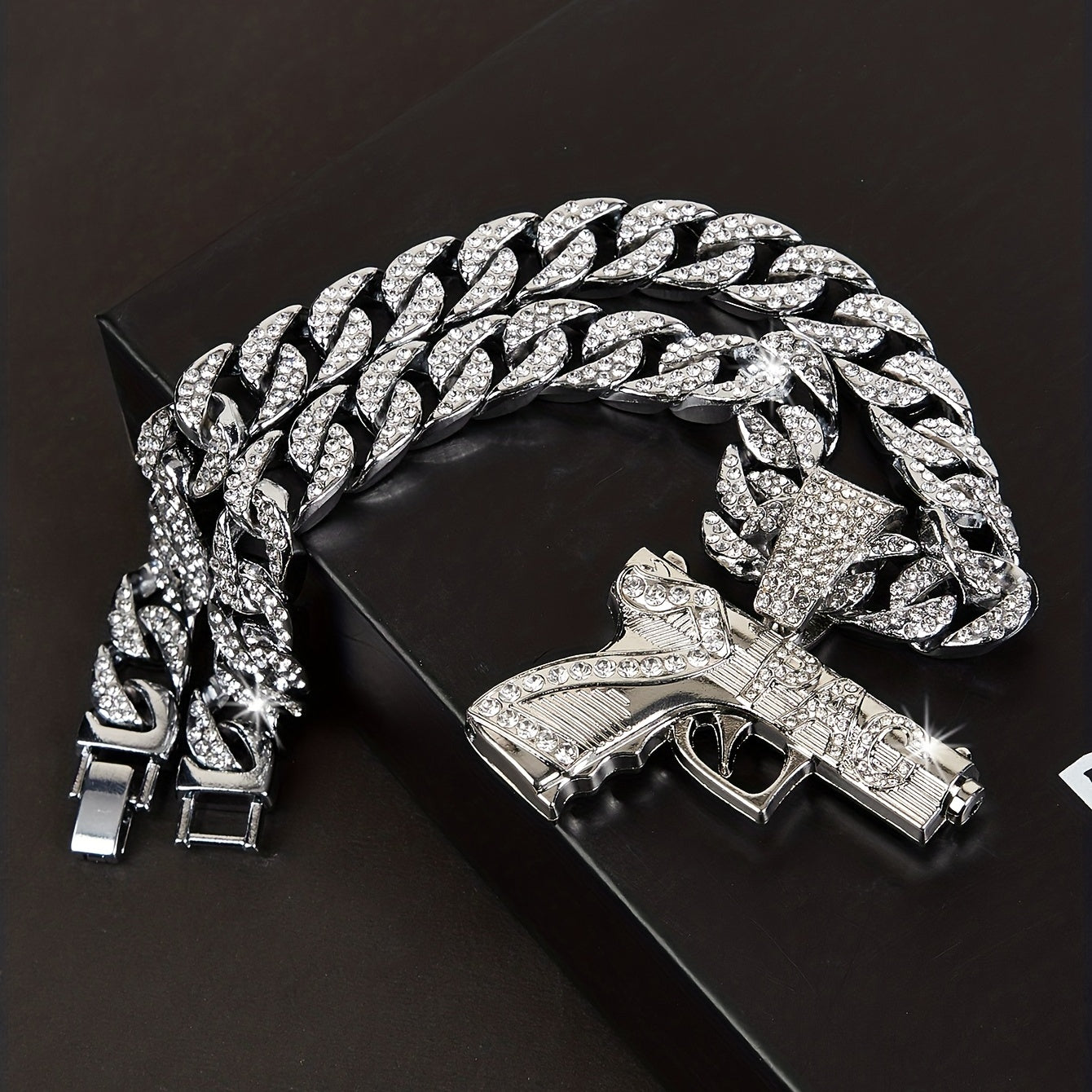 Add some urban flair to your style with this hip hop gun pendant necklace featuring rhinestone embellishments on a Cuban link chain.
