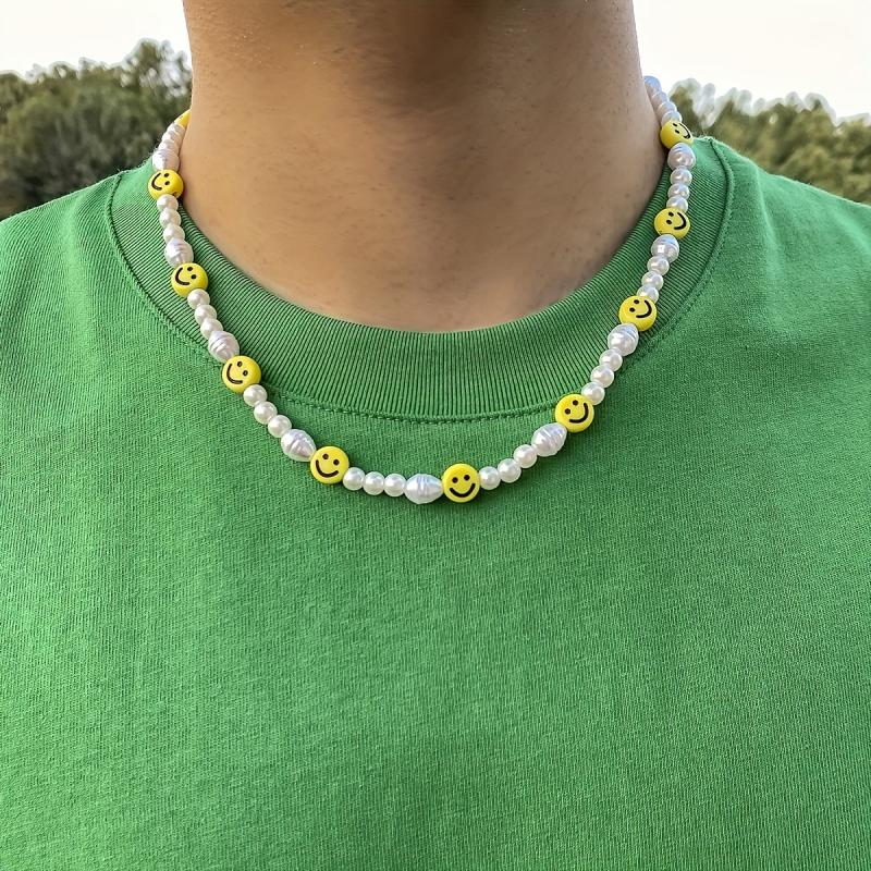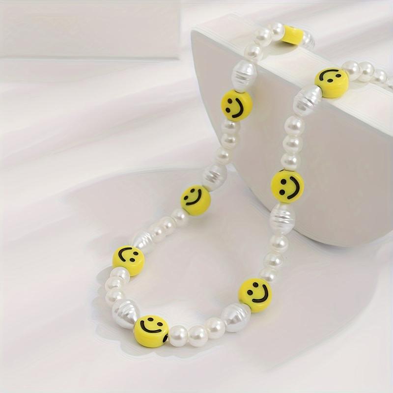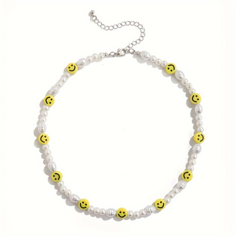 Elevate your style with this unique clavicle chain adorned with pearls and a joyful face pendant. Perfect for school and vacation wear.