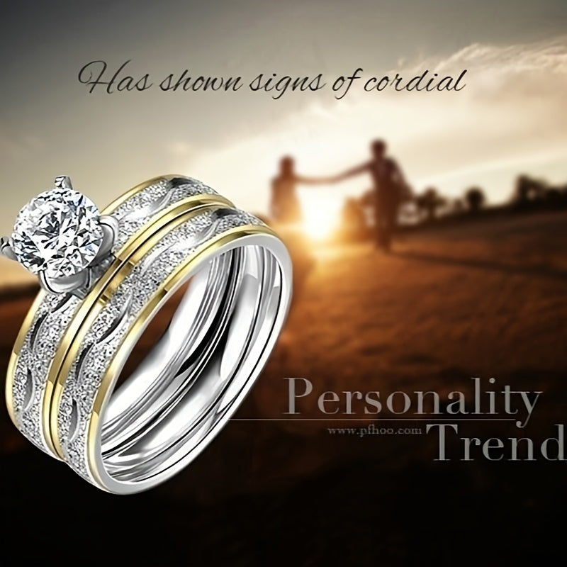 Elegant set of titanium steel wedding rings, perfect for couples. Women's set includes 2 rings while men's set includes a single ring.