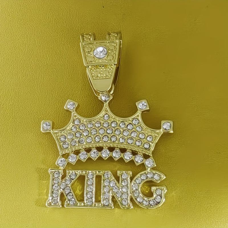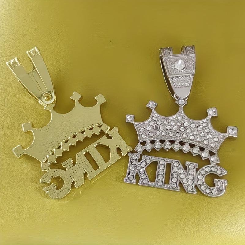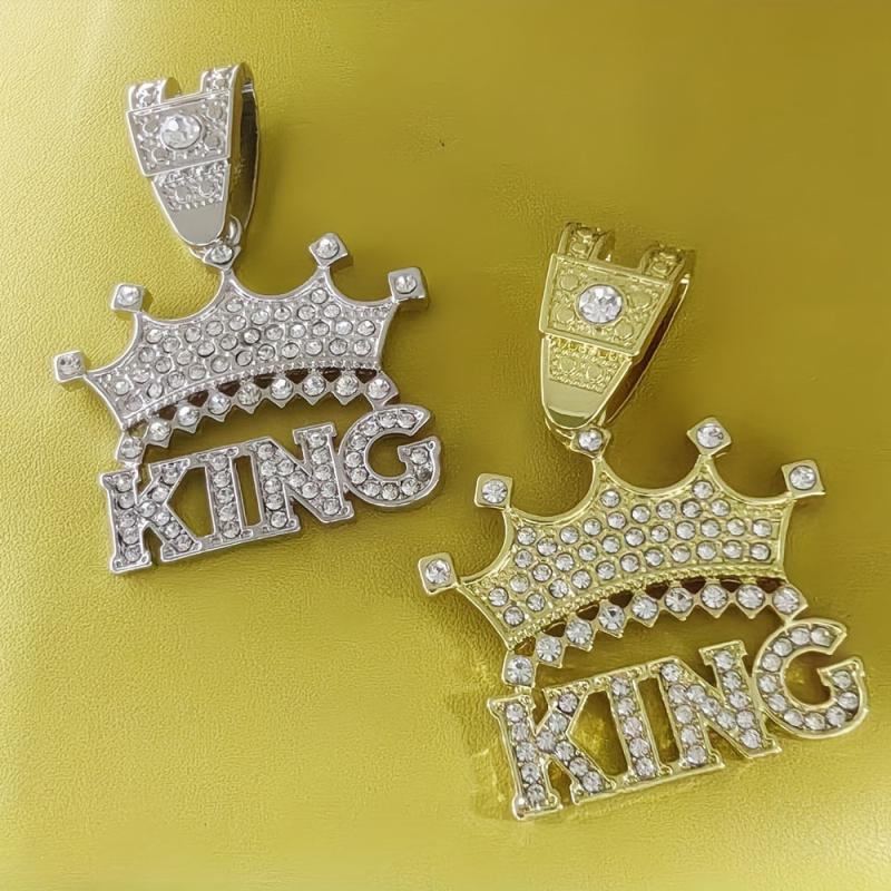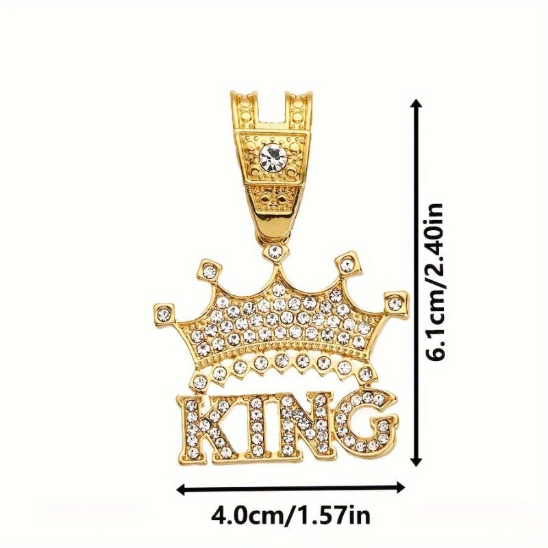 Unleash your inner royalty with this funky crown pendant necklace featuring sparkling crystals and bold KING lettering. Perfect for casual or statement looks.
