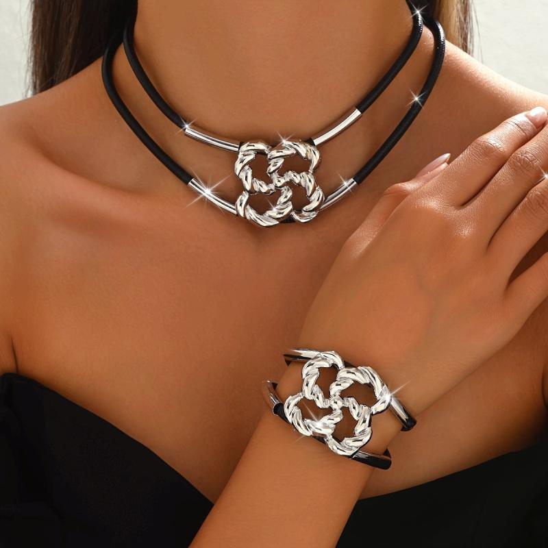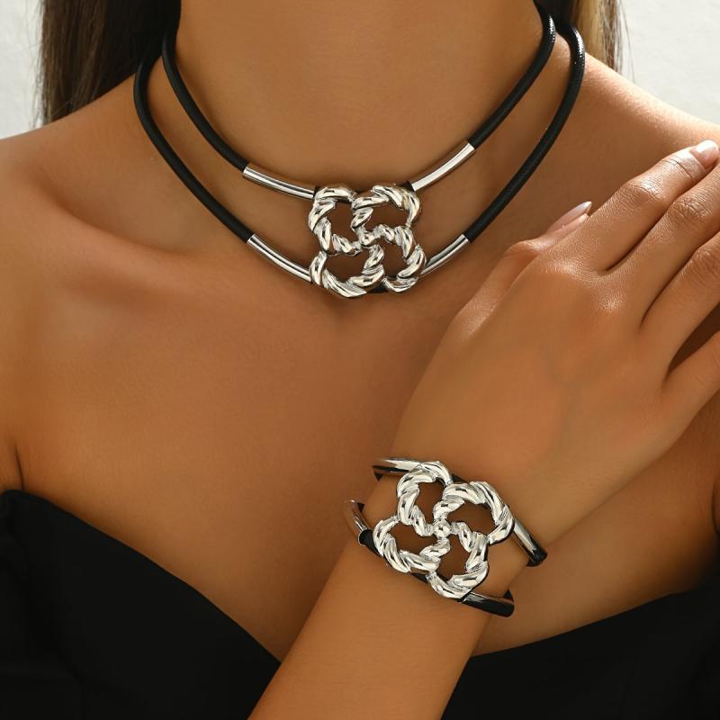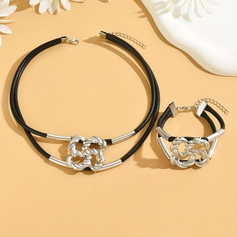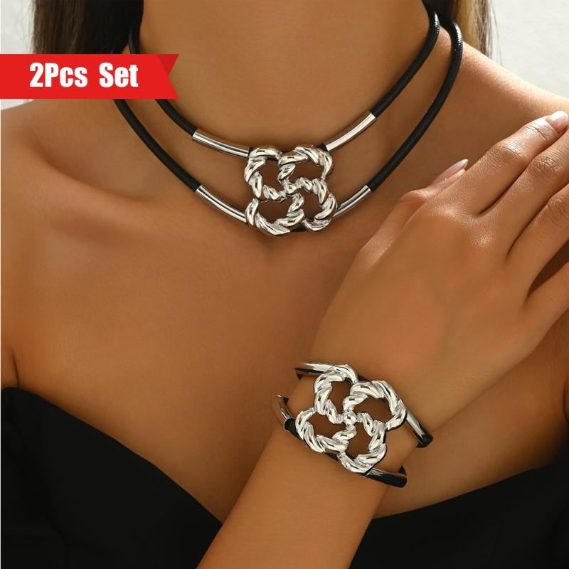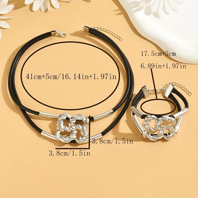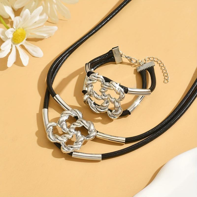 Elevate your style with this fashionable set featuring a hollow out twisted flower pendant on a double strand rope necklace and bracelet.