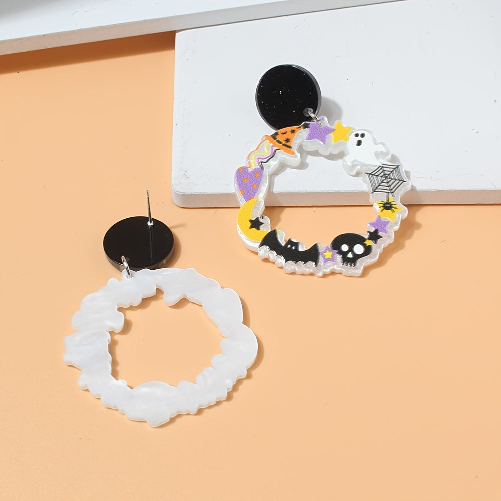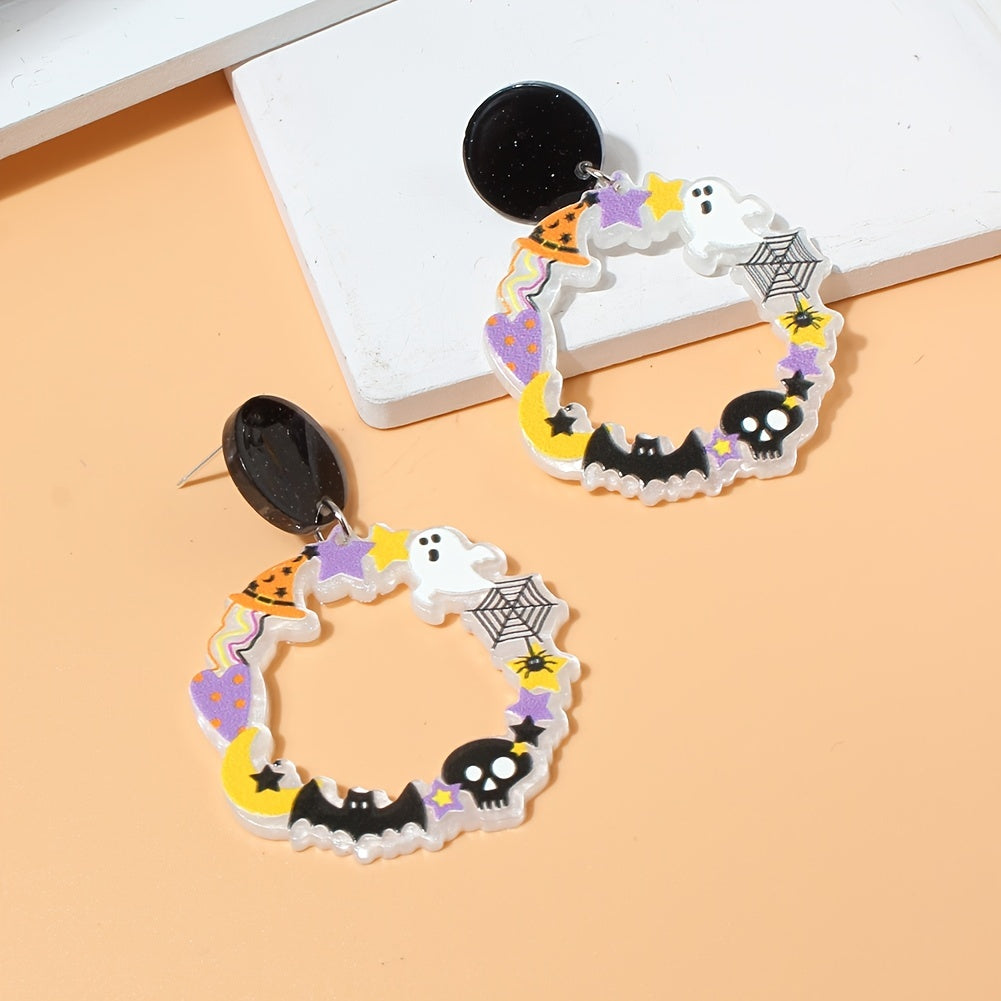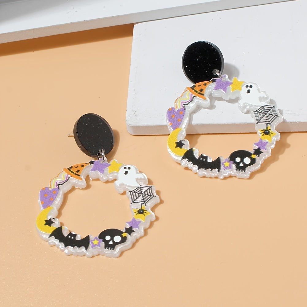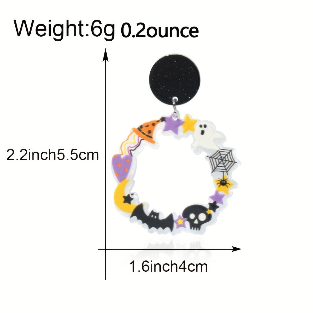 These unique dangle earrings feature a hollow round shape with ghost, pumpkin, spider web, and bat decorations. Perfect for adding a spooky touch to your Halloween outfit.