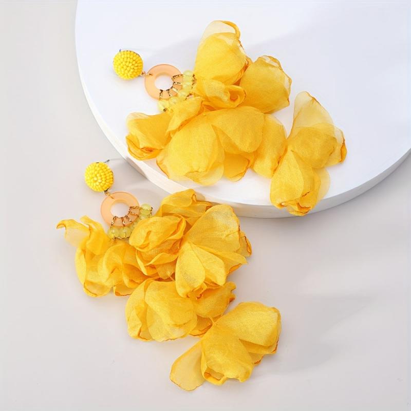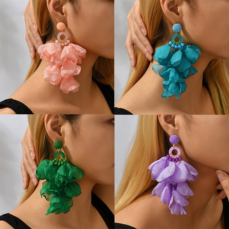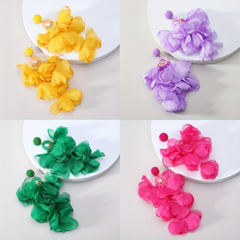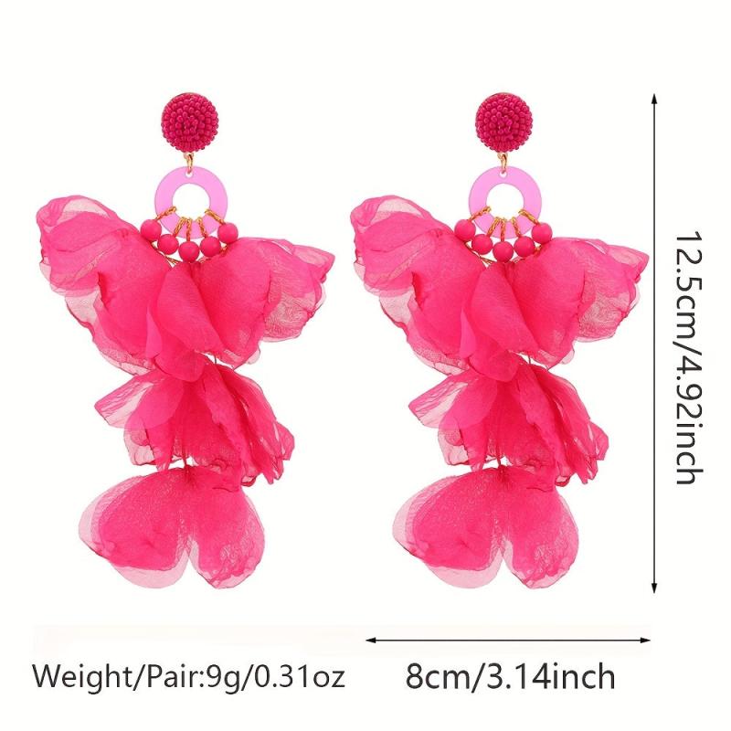 Make a statement with these hot pink dangle earrings featuring exaggerated fabric flower petals. Perfect for vacations, stages, and as female ornaments.