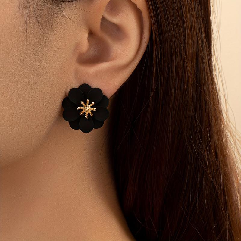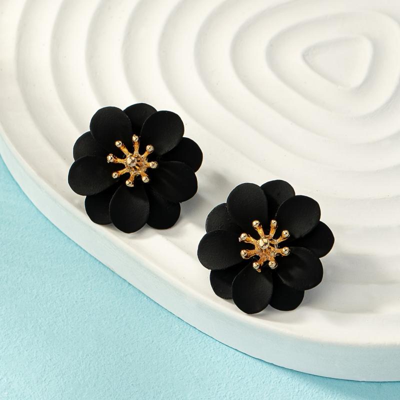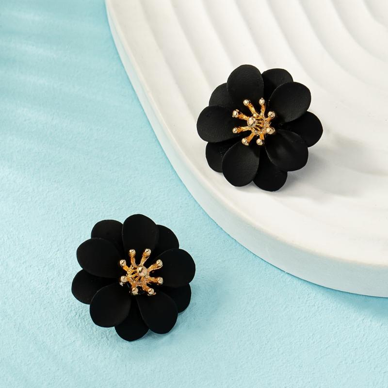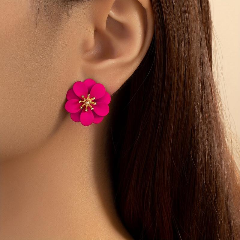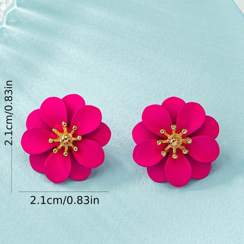 Add a pop of color to your summer outfits with these hot pink flower-shaped stud earrings. Made of iron with 18K gold plating, these earrings are perfect for a bohemian leisure style look during your summer vacation.