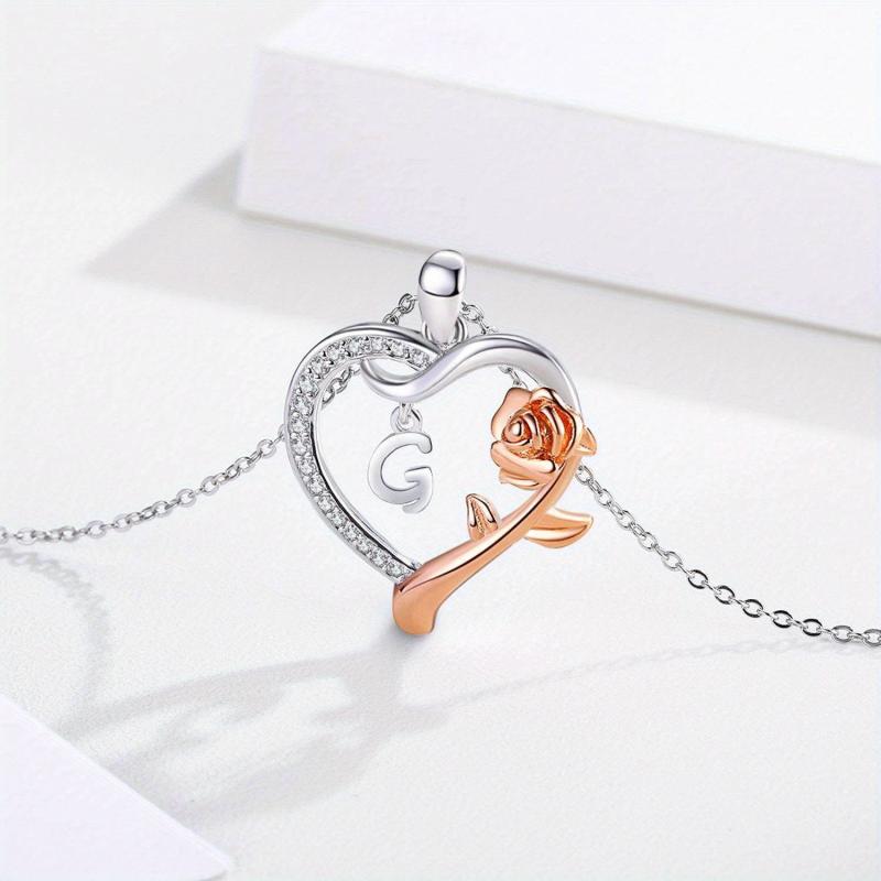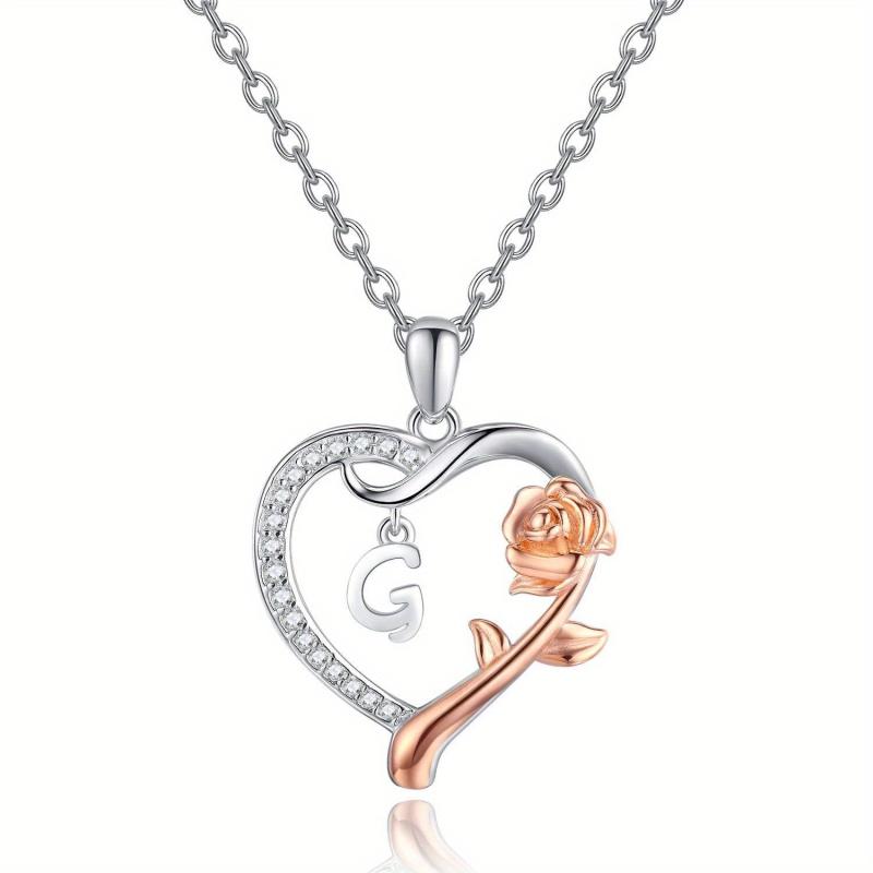 This personalised initial necklace features a roseflower heart design made of sterling silver. A perfect gift for women and girls.