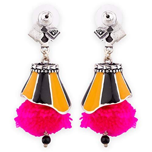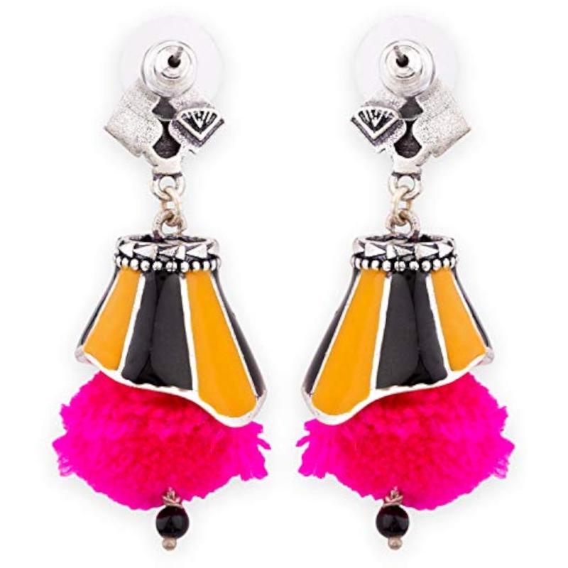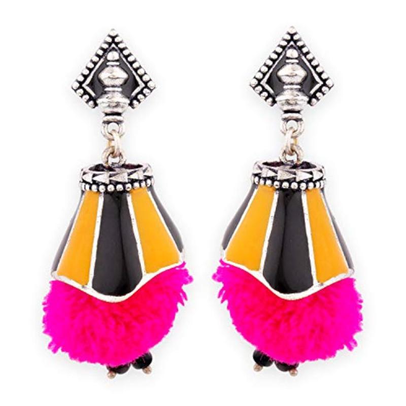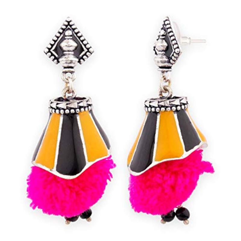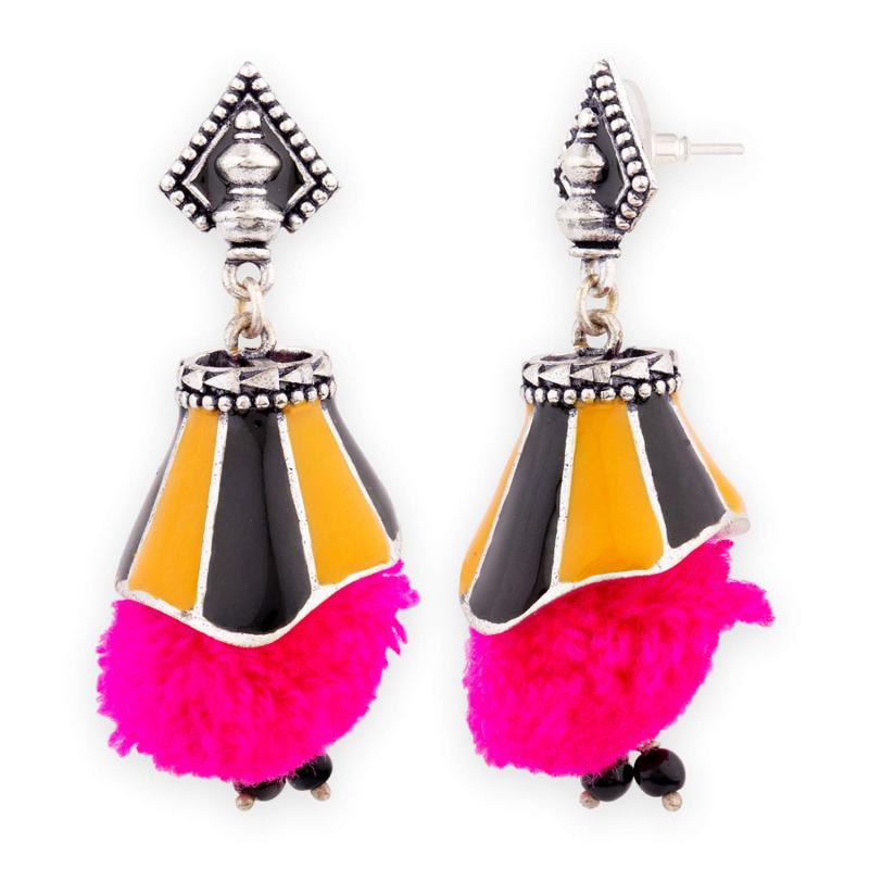 Add a pop of color to your outfit with these stylish pink pom pom earrings inspired by the Kalbelia tribe.
