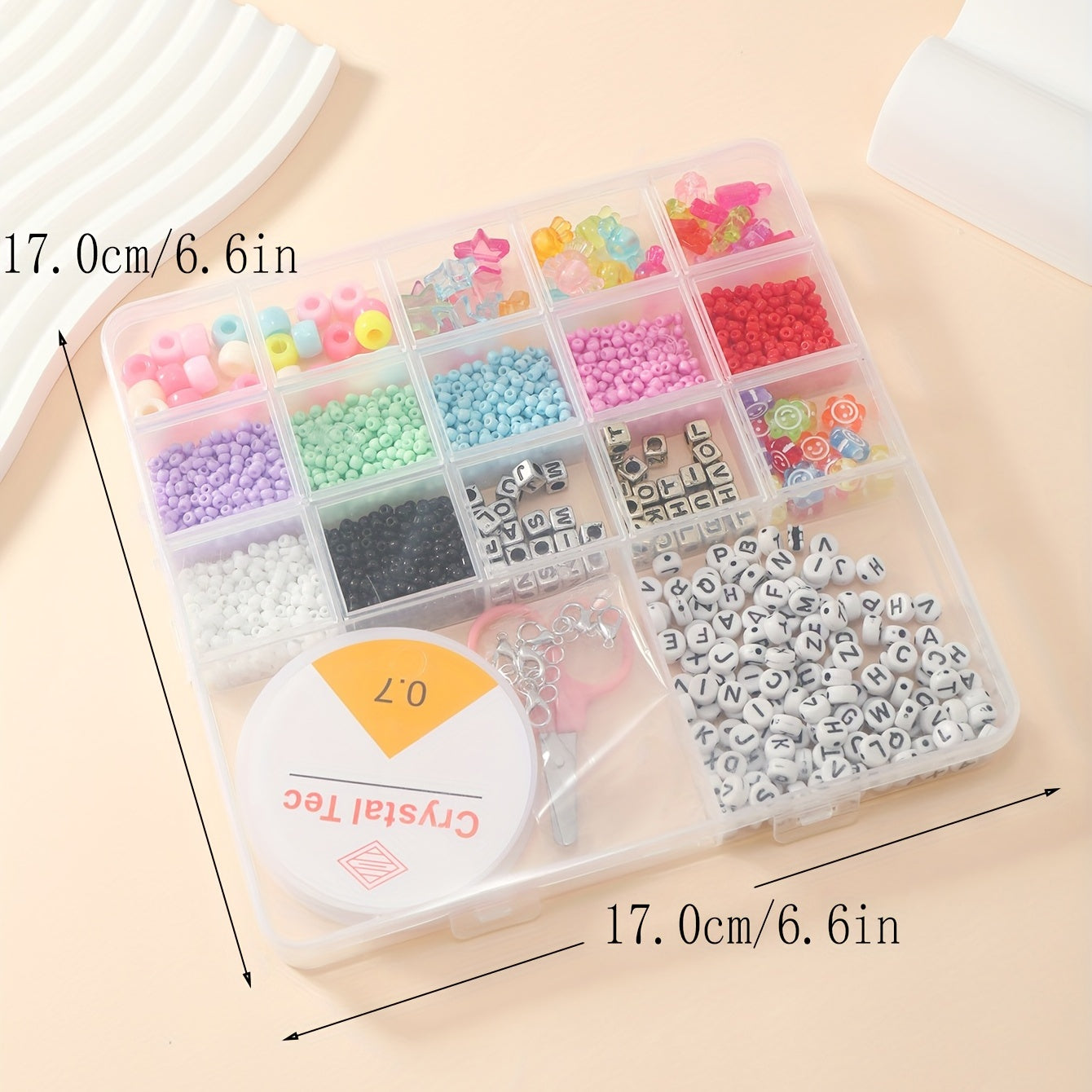 This set includes soft pottery beads, letter beads, glass rice beads, colorful plastic beads, and tools for children's creative jewelry making.