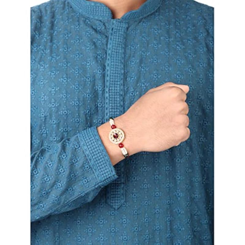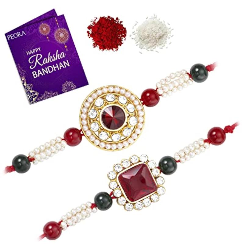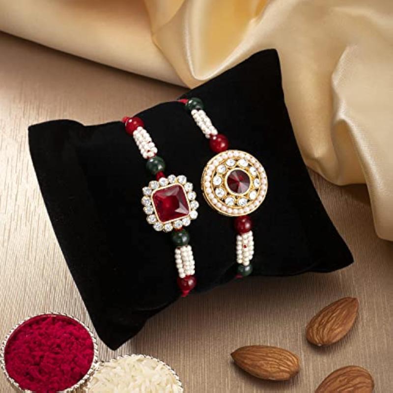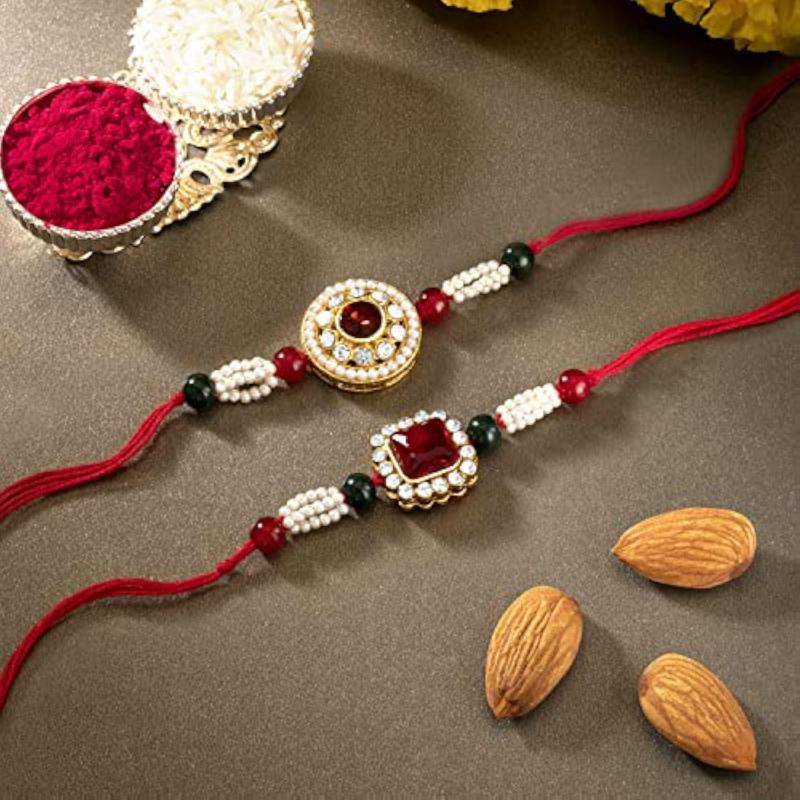 Celebrate Raksha Bandhan with this beautiful Kundan Beads Rakhi Bracelet Combo Pack that includes 2 Rakhis, Chawal, Roli, and a Greeting Card for Brother.