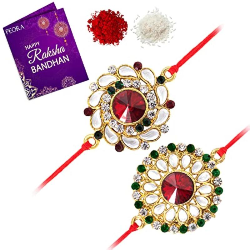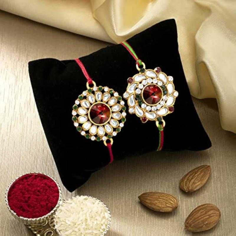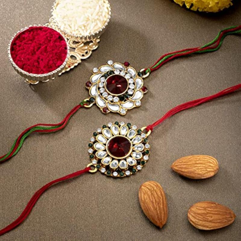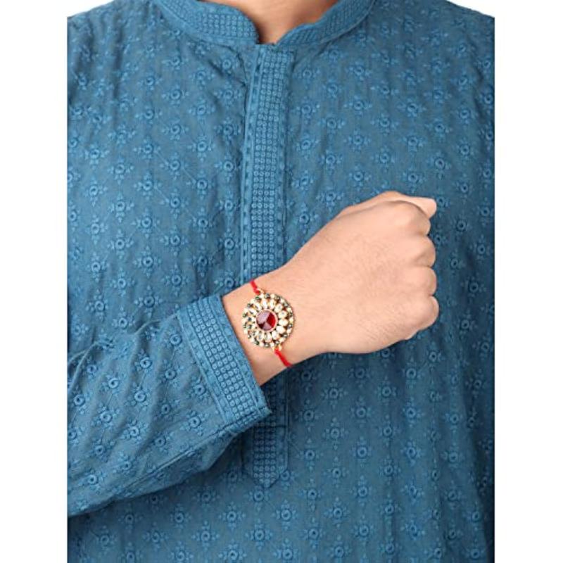 Celebrate Raksha Bandhan in style with this elegant combo pack featuring Kundan beads Rakhi, Chawal, Roli, and a greeting card. Perfect for gifting to your sibling.