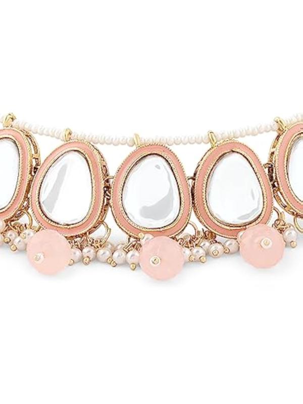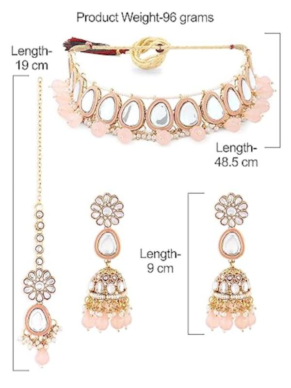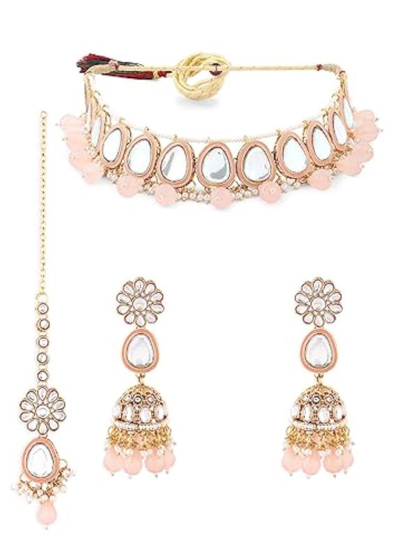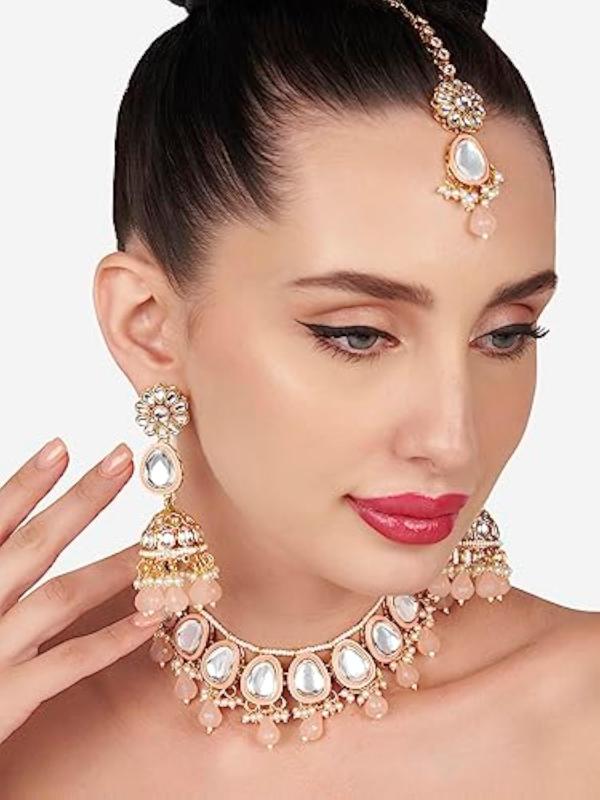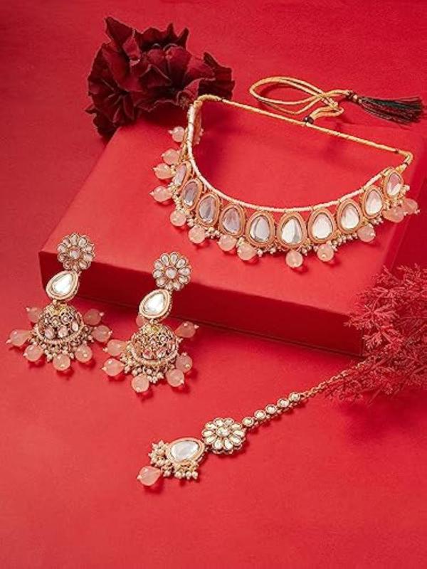 Elegant beaded Kundan choker set with coordinating earrings and maangtikka to elevate your traditional look.