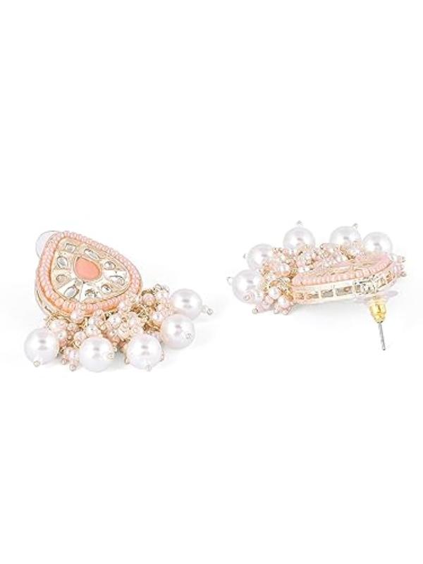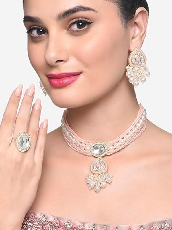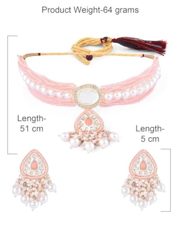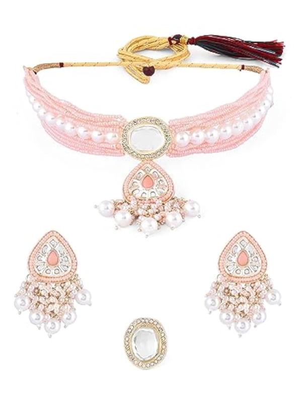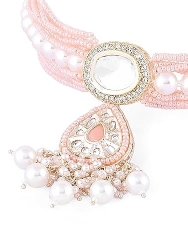 Elegant multistrand beaded choker set with kundan cluster design, perfect for women.